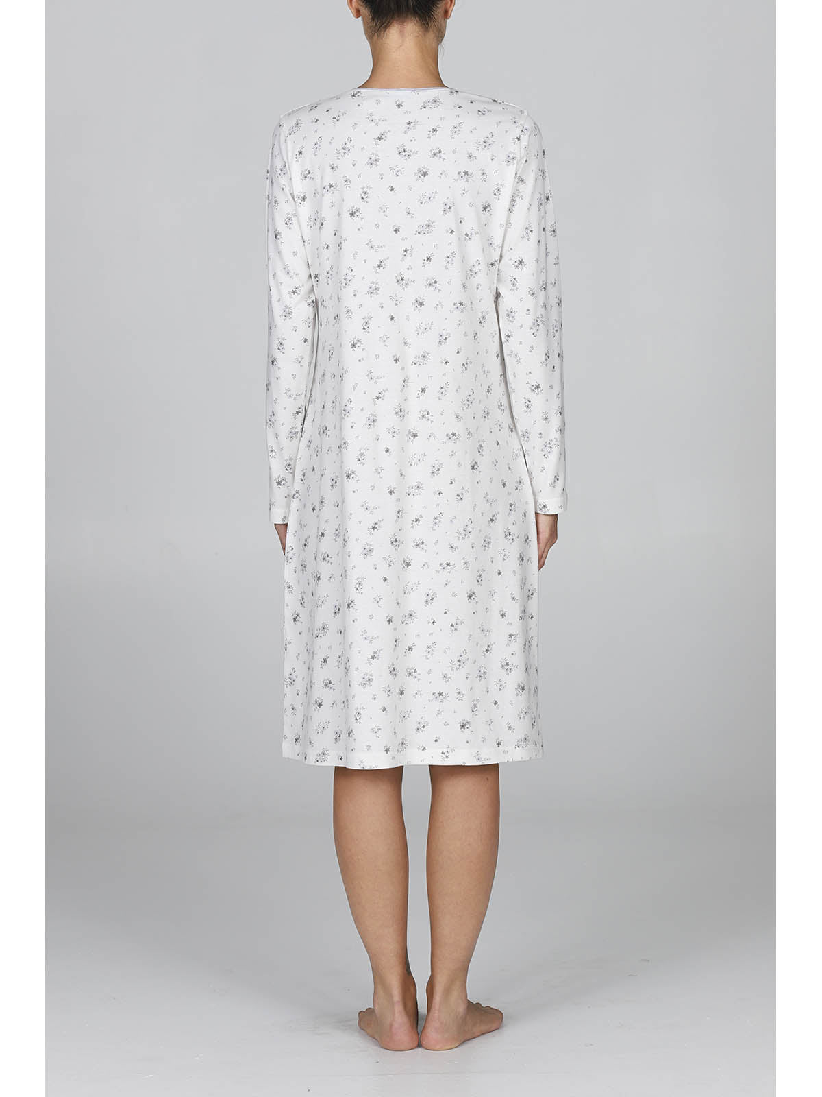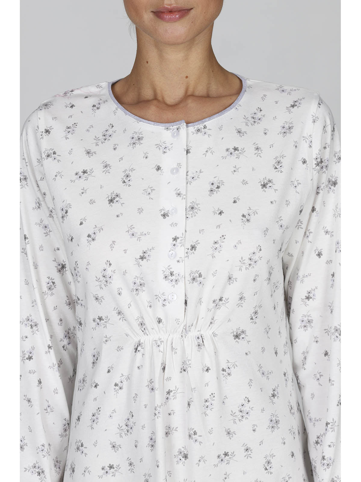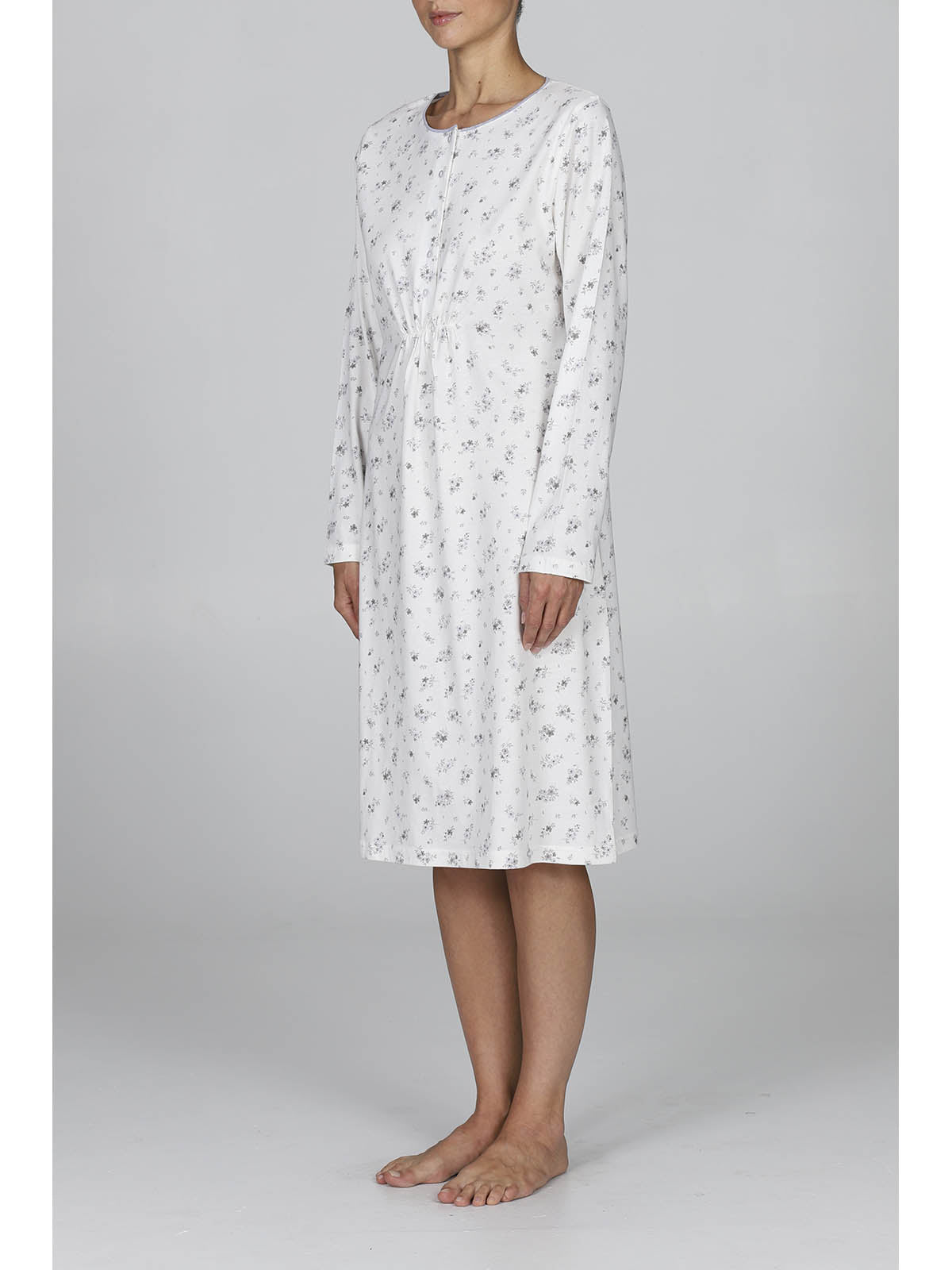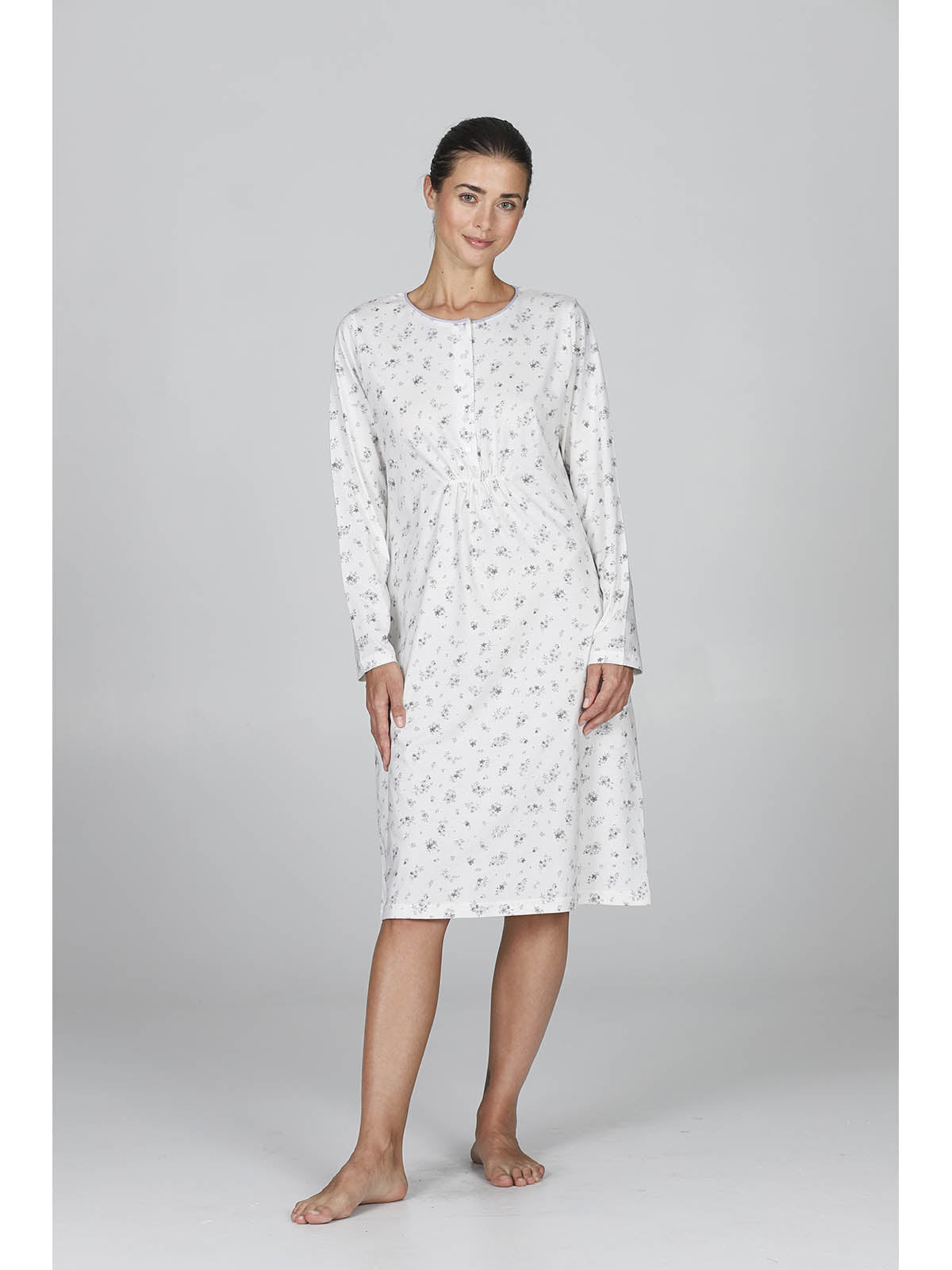 Camicia da notte donna in fresco jersey 30/1 di puro cotone pettinato. Modello con scollo ampio, manica lunga con dettaglio dell'arriccio sul davanti in piccola fantasia floreale. Comfort moderno per una femminilità classica firmata Alpina.