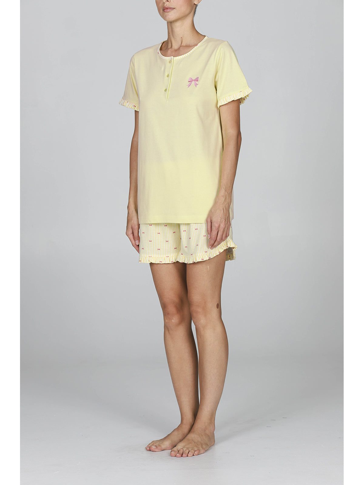 Pigiama corto donna in fresco jersey 30/1 di puro cotone pettinato realizzato in allegro giallo, delicata fantasia a righe con fiocchi rosa. Modello con scollo ampio e manica corta. Pantaloncino corto con rouches. Delicata stampa fiocco sulla giacca. La qualità del marchio Alpina con tutta la freschezza e traspirabilità del puro cotone.
