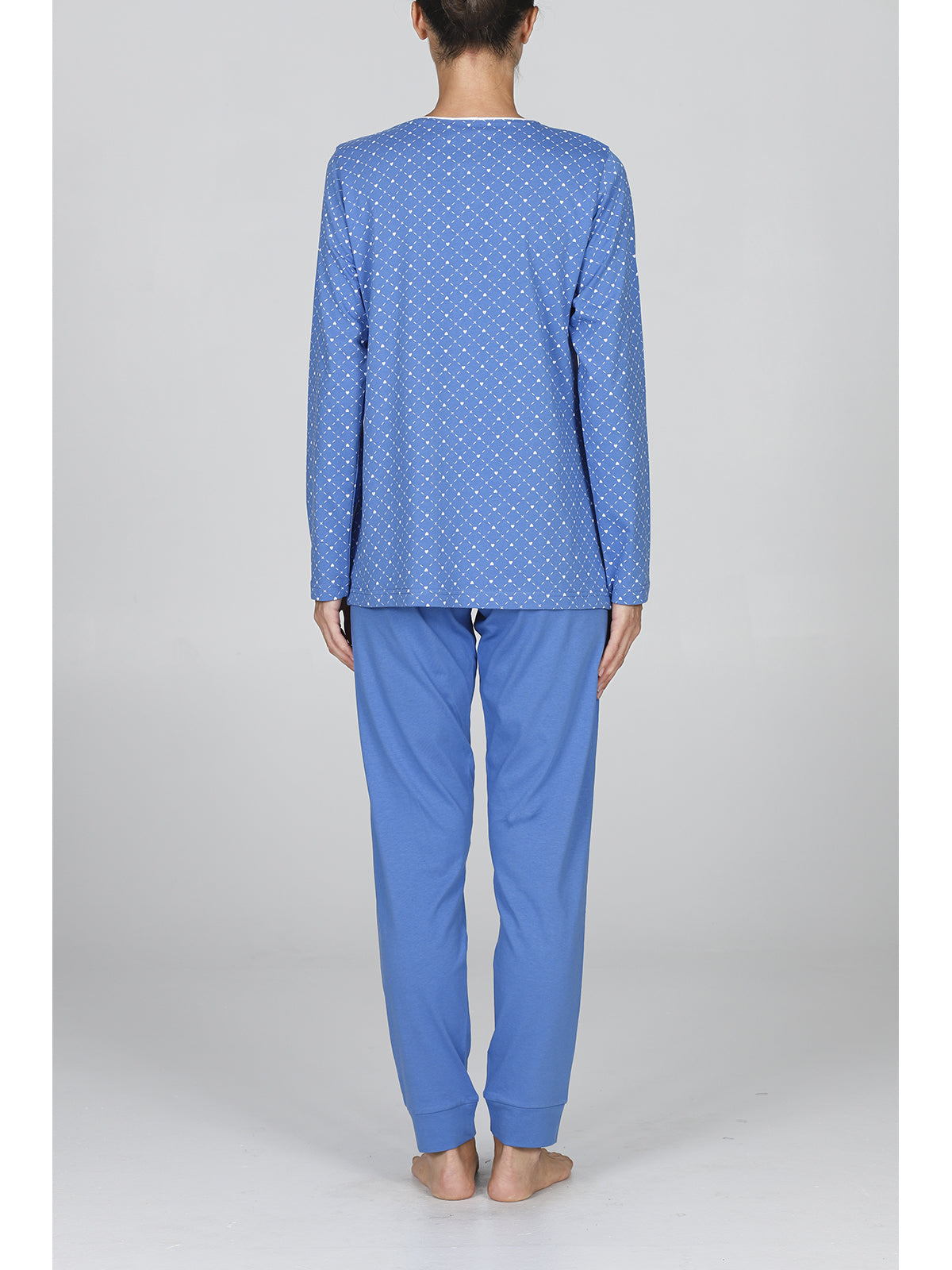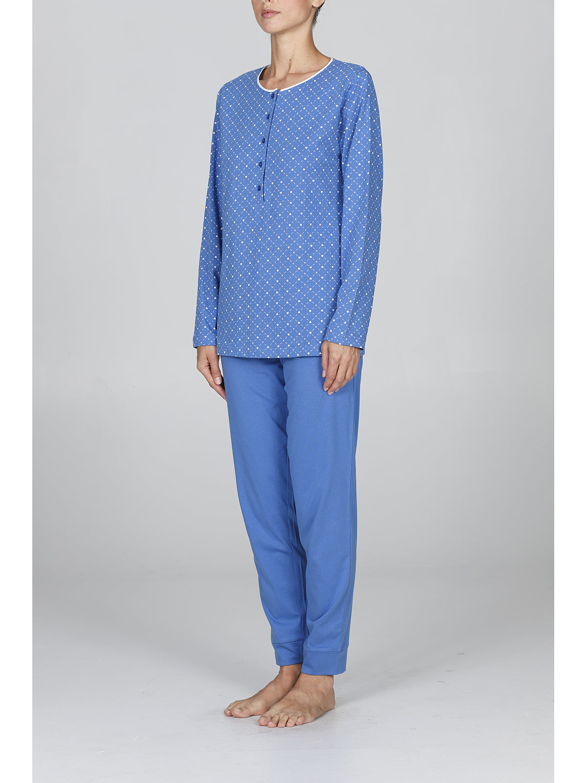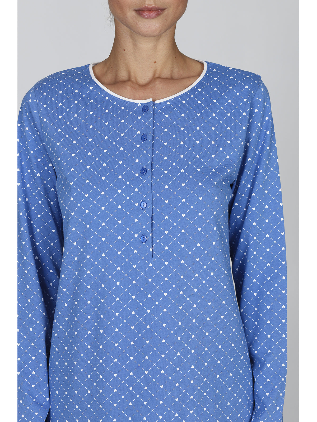 Pigiama donna in fresco jersey 30/1 di puro cotone pettinato. Maglia a manica lunga, modello con apertura a bottoni profonda in deliziosa fantasia cuoricini. Pantalone lungo con bordi in tinta unita. Comfort moderno per una femminilità classica firmata Alpina.