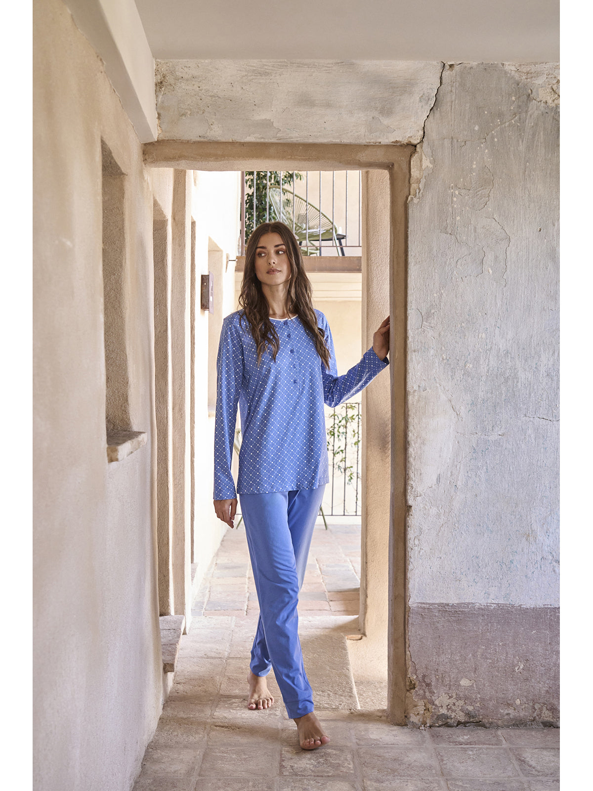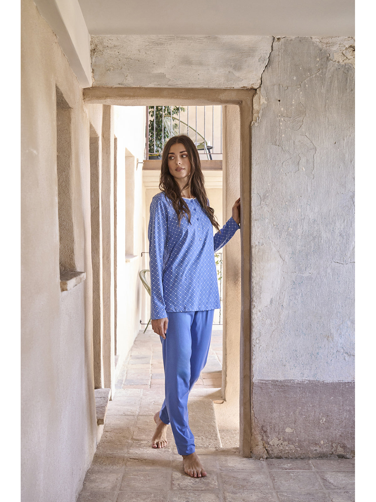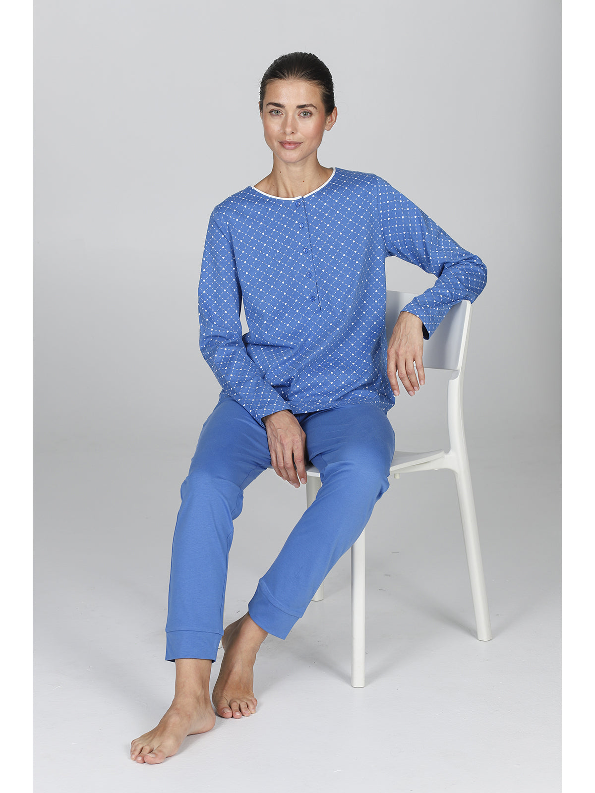 Pigiama donna in fresco jersey 30/1 di puro cotone pettinato. Maglia a manica lunga, modello con apertura a bottoni profonda in deliziosa fantasia cuoricini. Pantalone lungo con bordi in tinta unita. Comfort moderno per una femminilità classica firmata Alpina.