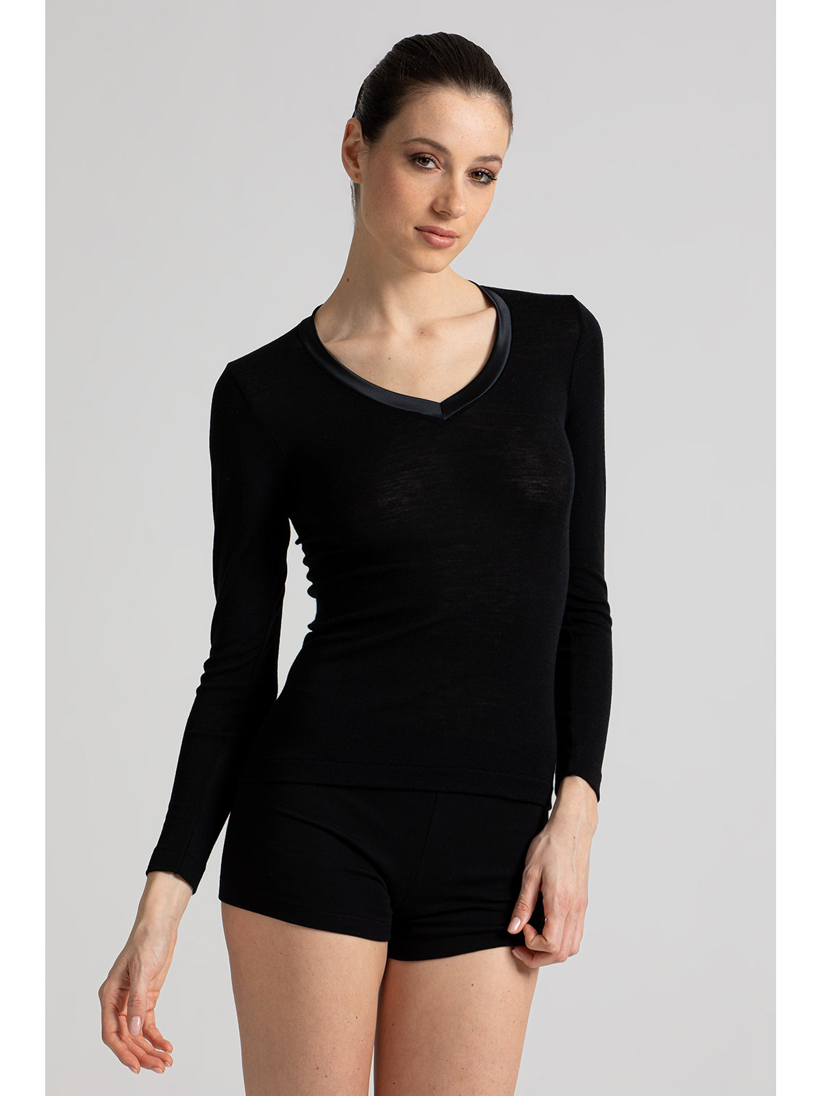 Maglietta intima donna modello a manica lunga in lana e seta per un massimo comfort e calore. Elegante scollo in raso. Tutto il tepore della lana senza rinunciare alla lucentezza della seta. Sulla tua pelle solo fibre naturali.