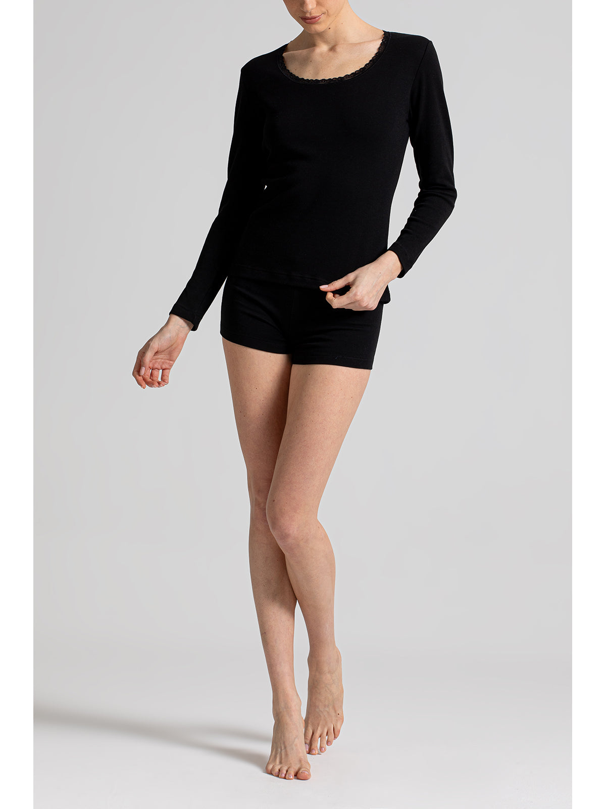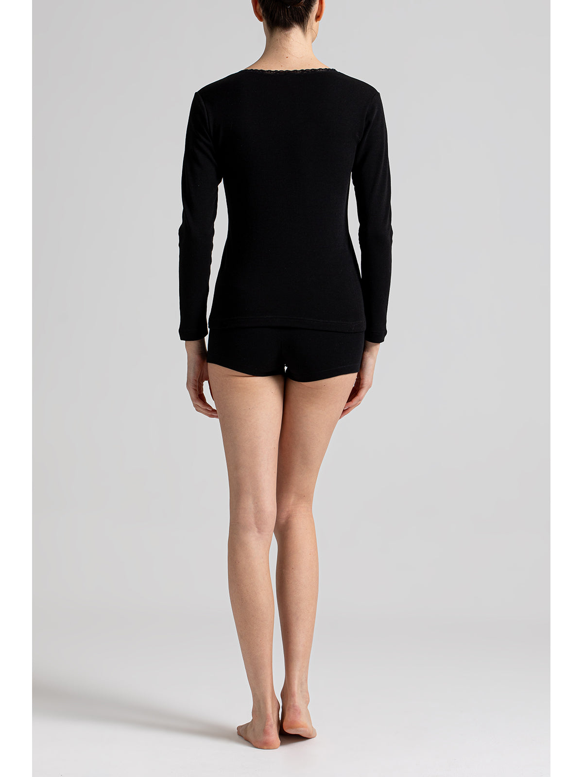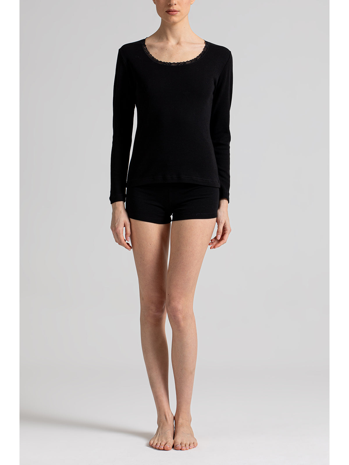 Maglietta manica lunga in interlock di puro cotone felpato. La lavorazione della garzatura che subisce provoca la formazione di piccolissimi riccioli in cotone che rendono il tessuto più morbido, trattenendo il calore del corpo e dando una sensazione di tepore, per questo lo chiamiamo anche caldo cotone.