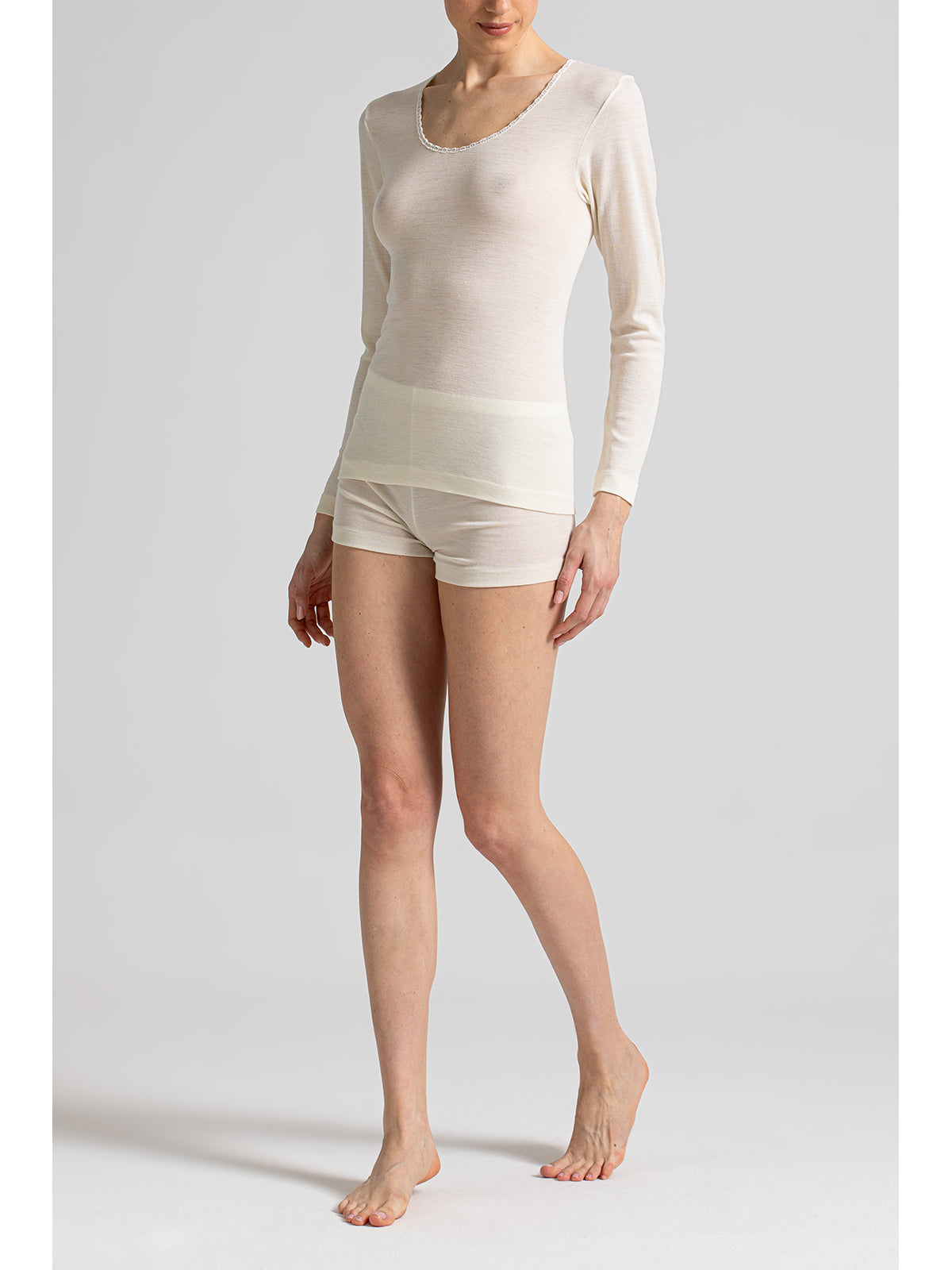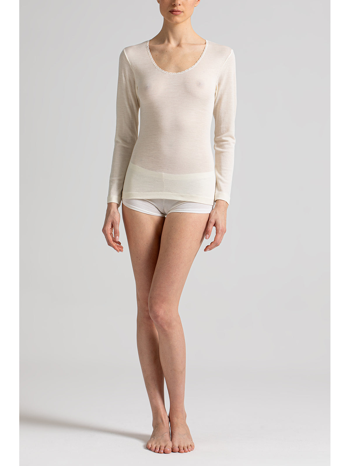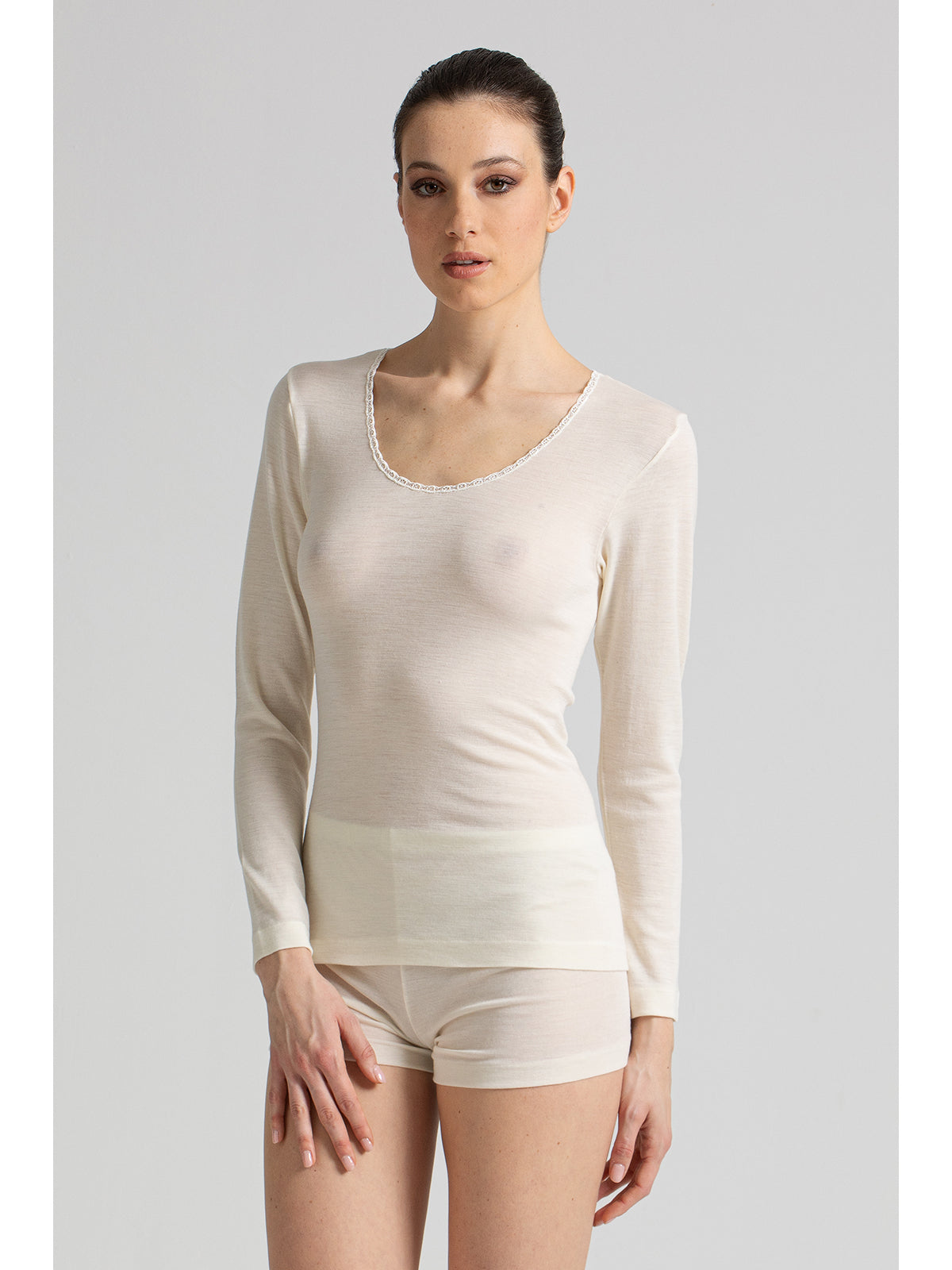 Maglietta intima donna modello a manica lunga in lana e seta per un massimo comfort e calore. Elegante scollo bordato da delizioso pizzo basso. Tutto il tepore della lana senza rinunciare alla lucentezza della seta. Sulla tua pelle solo fibre naturali.