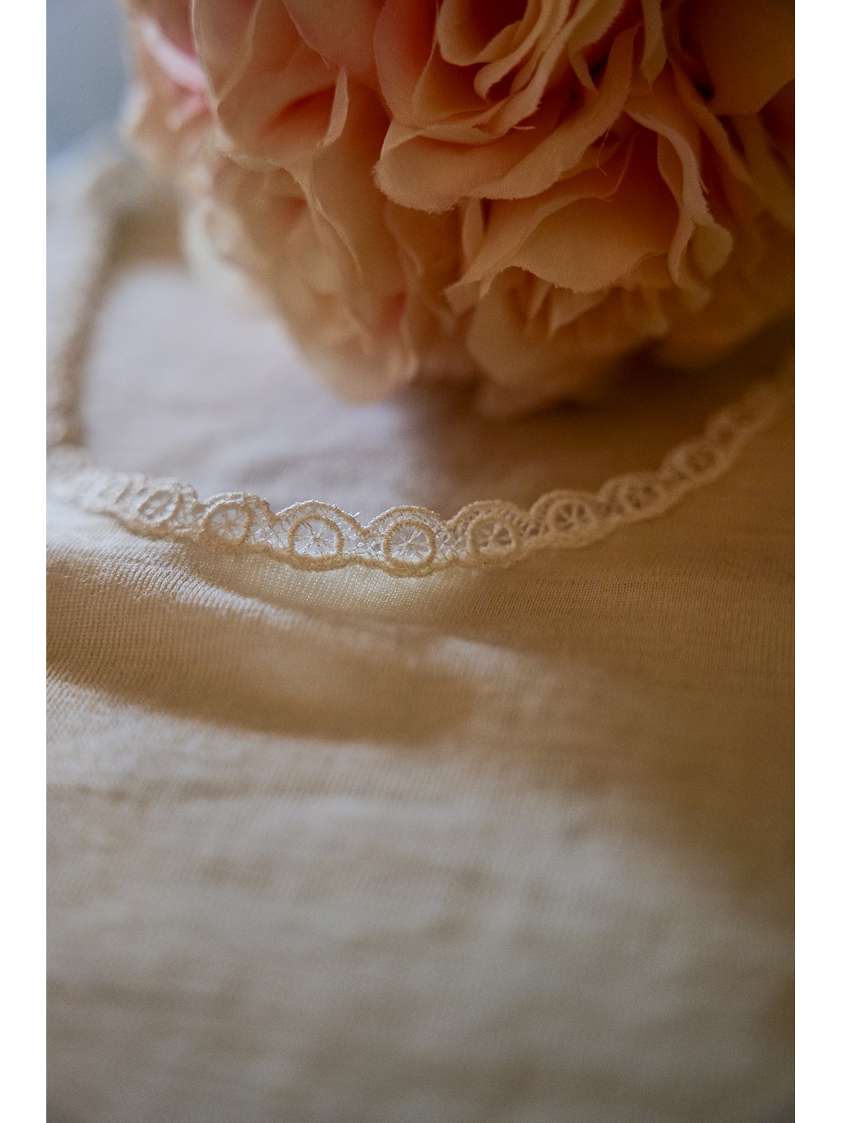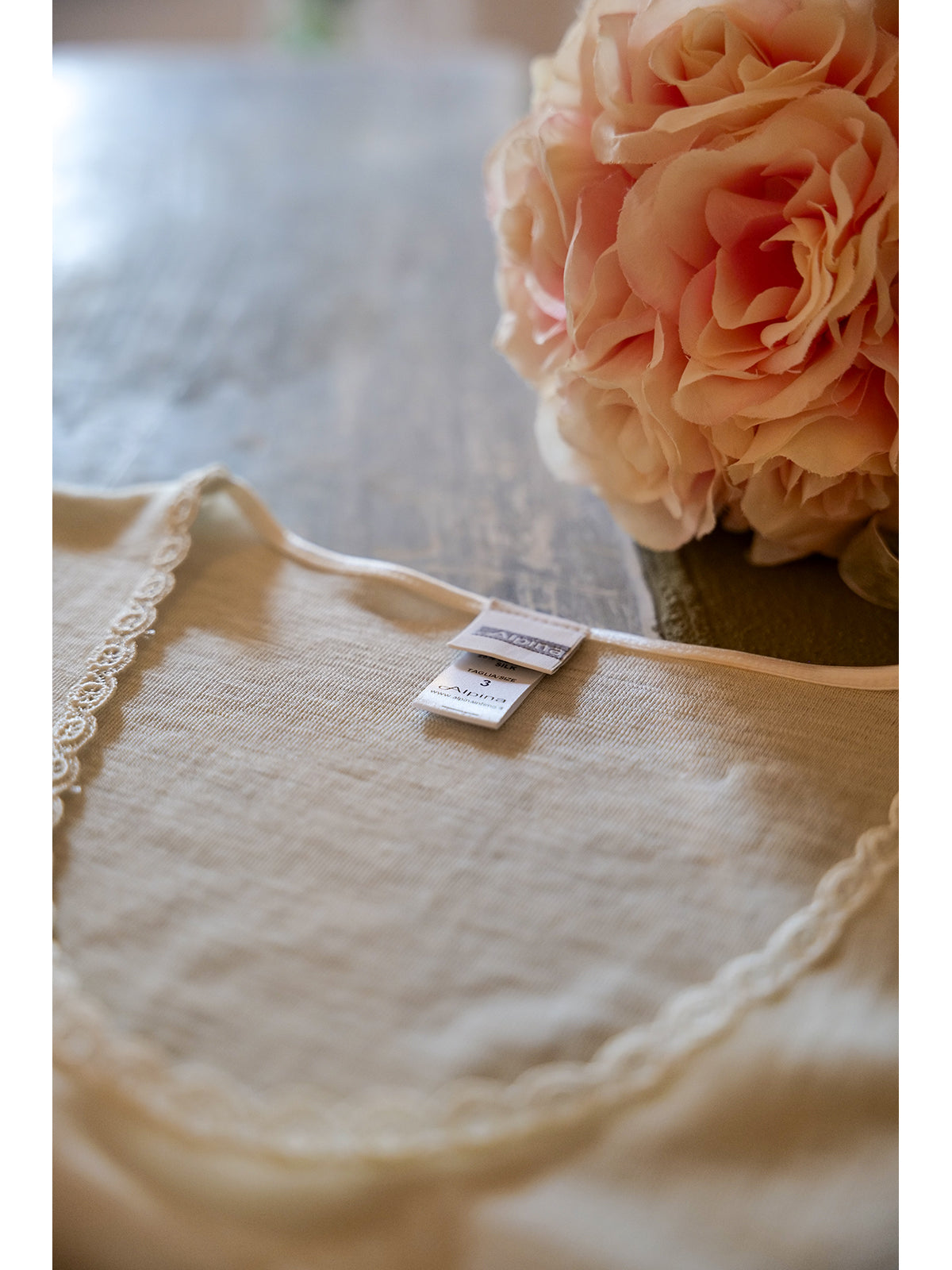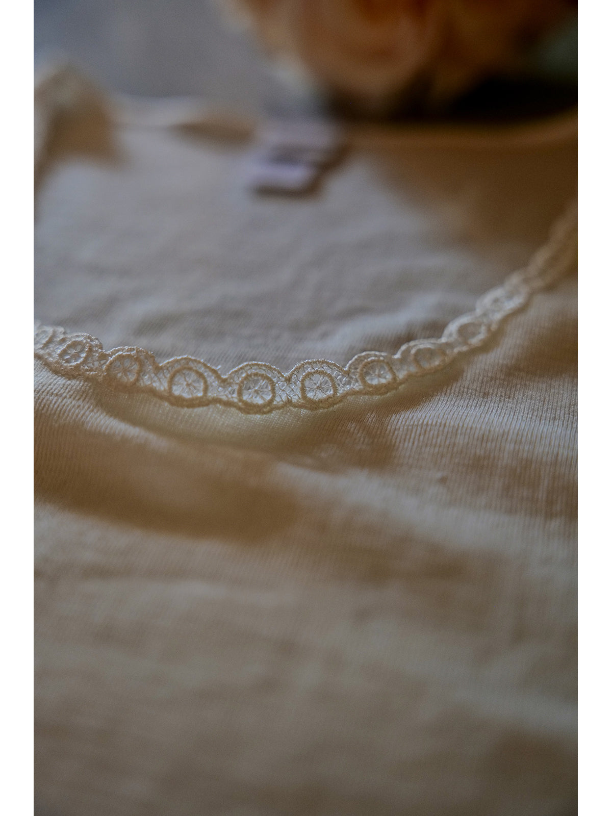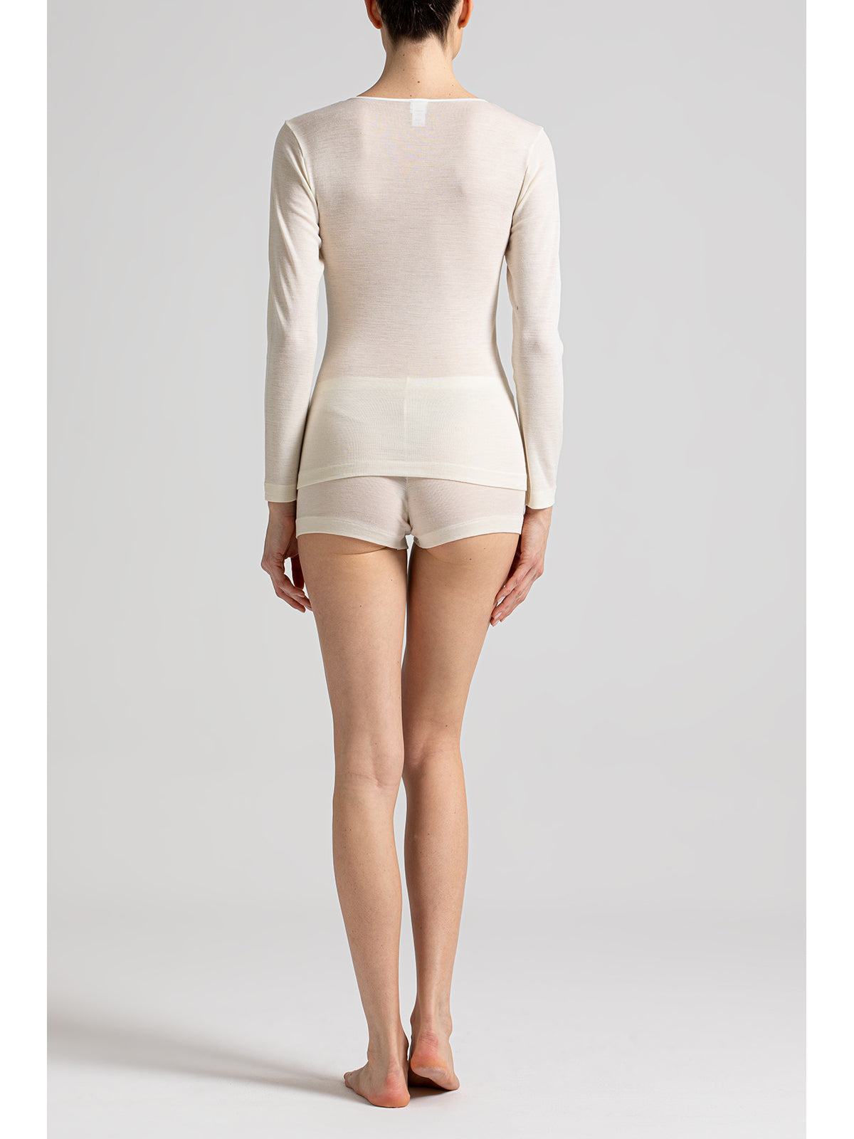Maglietta intima donna modello a manica lunga in lana e seta per un massimo comfort e calore. Elegante scollo bordato da delizioso pizzo basso. Tutto il tepore della lana senza rinunciare alla lucentezza della seta. Sulla tua pelle solo fibre naturali.