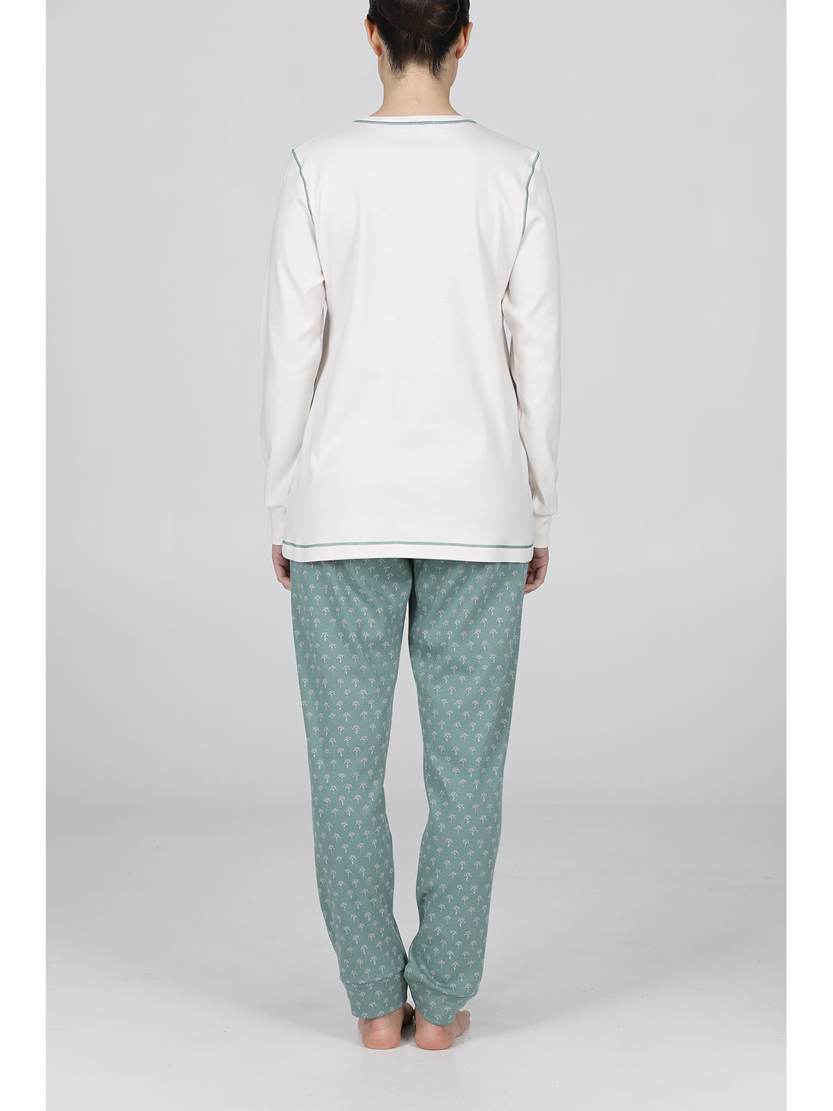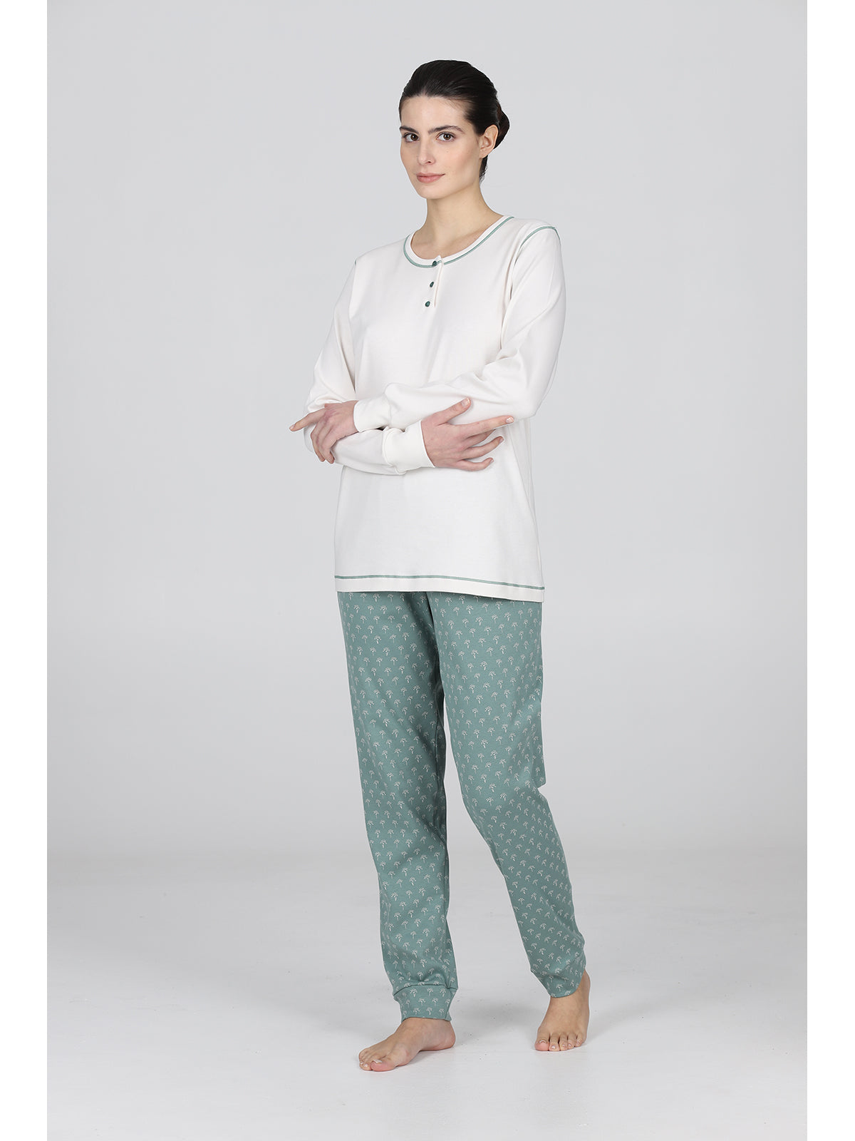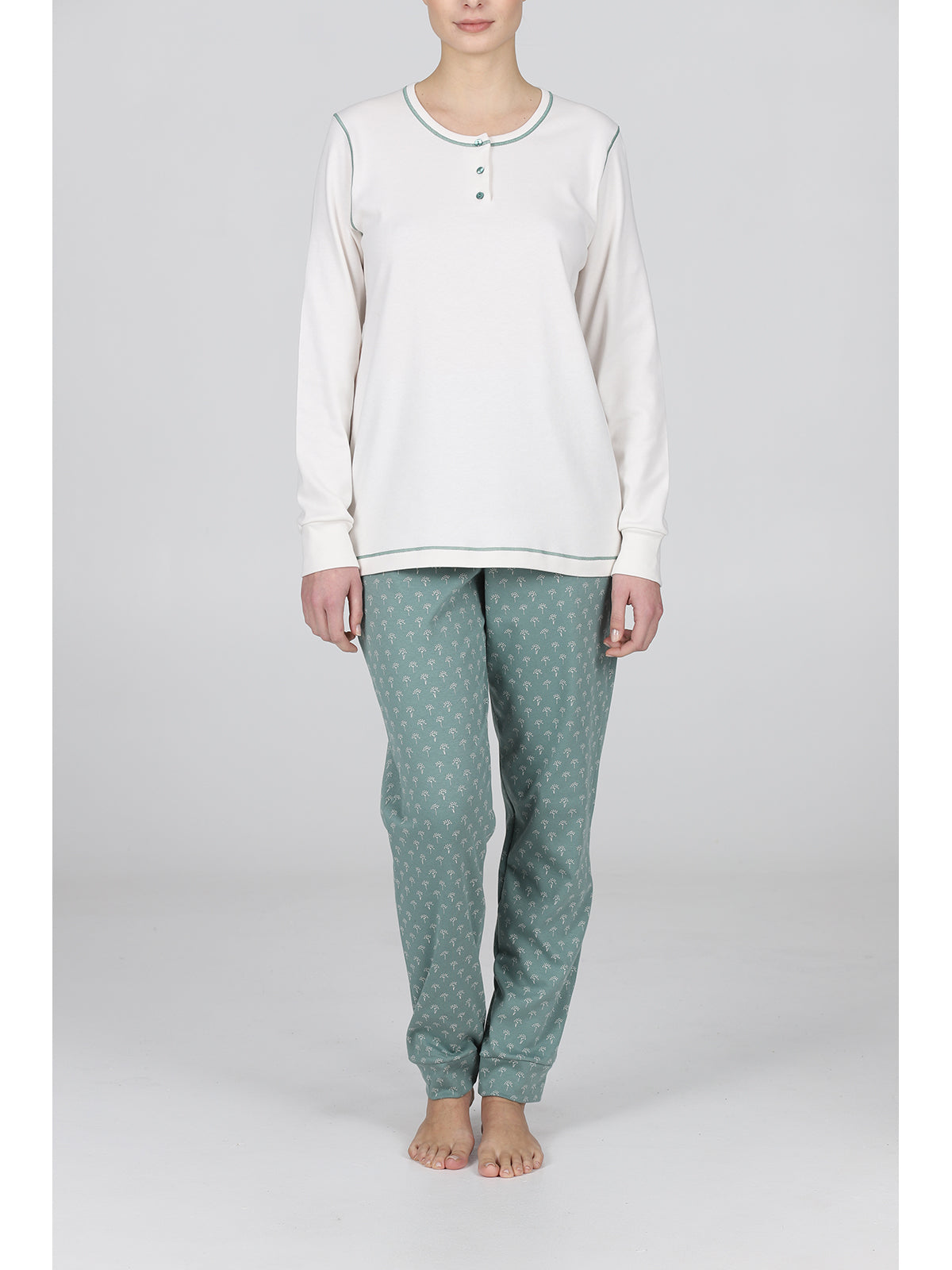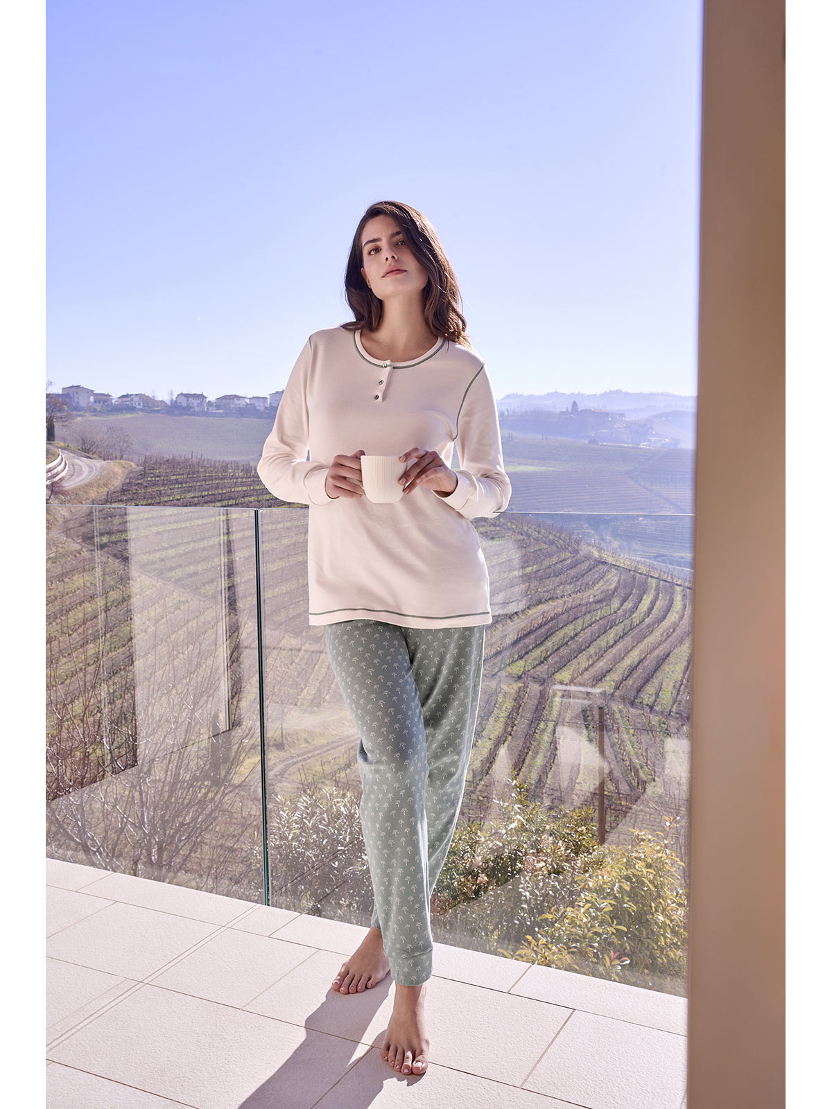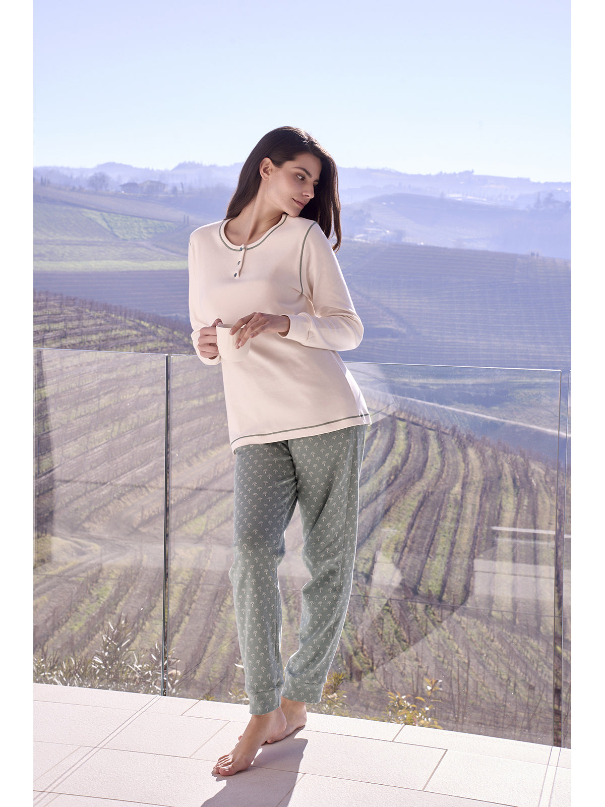 Pigiama donna in interlock 36/1 di puro cotone: caldo e confortevole, adatto alla notte e allo stare in casa. Modello con scollo serafino. Giacca in elegante tinta unita e pantaloni con esclusiva fantasia a fiorellino micro. Ideale per i soggetti più esigenti. Qualità e tradizione firmata Alpina.