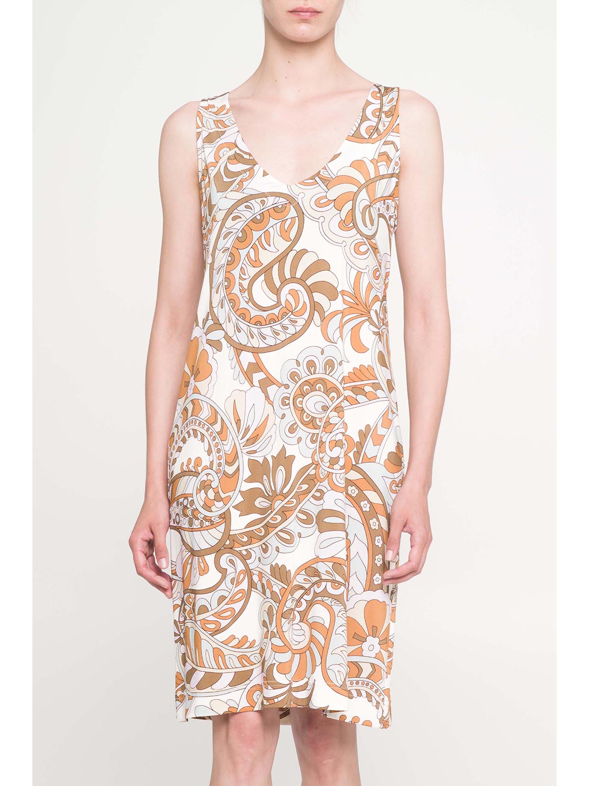 Abito donna in tessuto lucente. Davanti e dietro in stampa all over disegno cachemire. Modello senza maniche con scollo ampio. La lucentezza del tessuto conferisce praticità e stile.