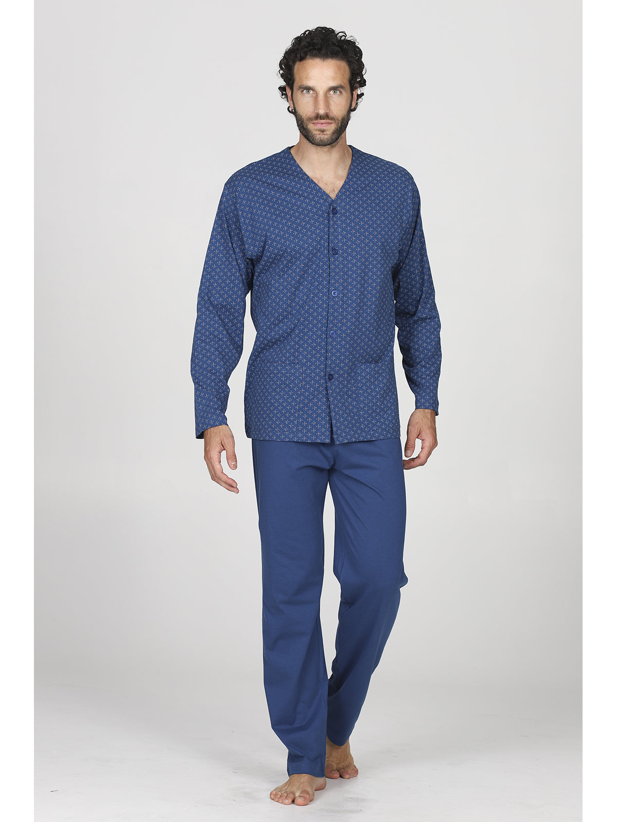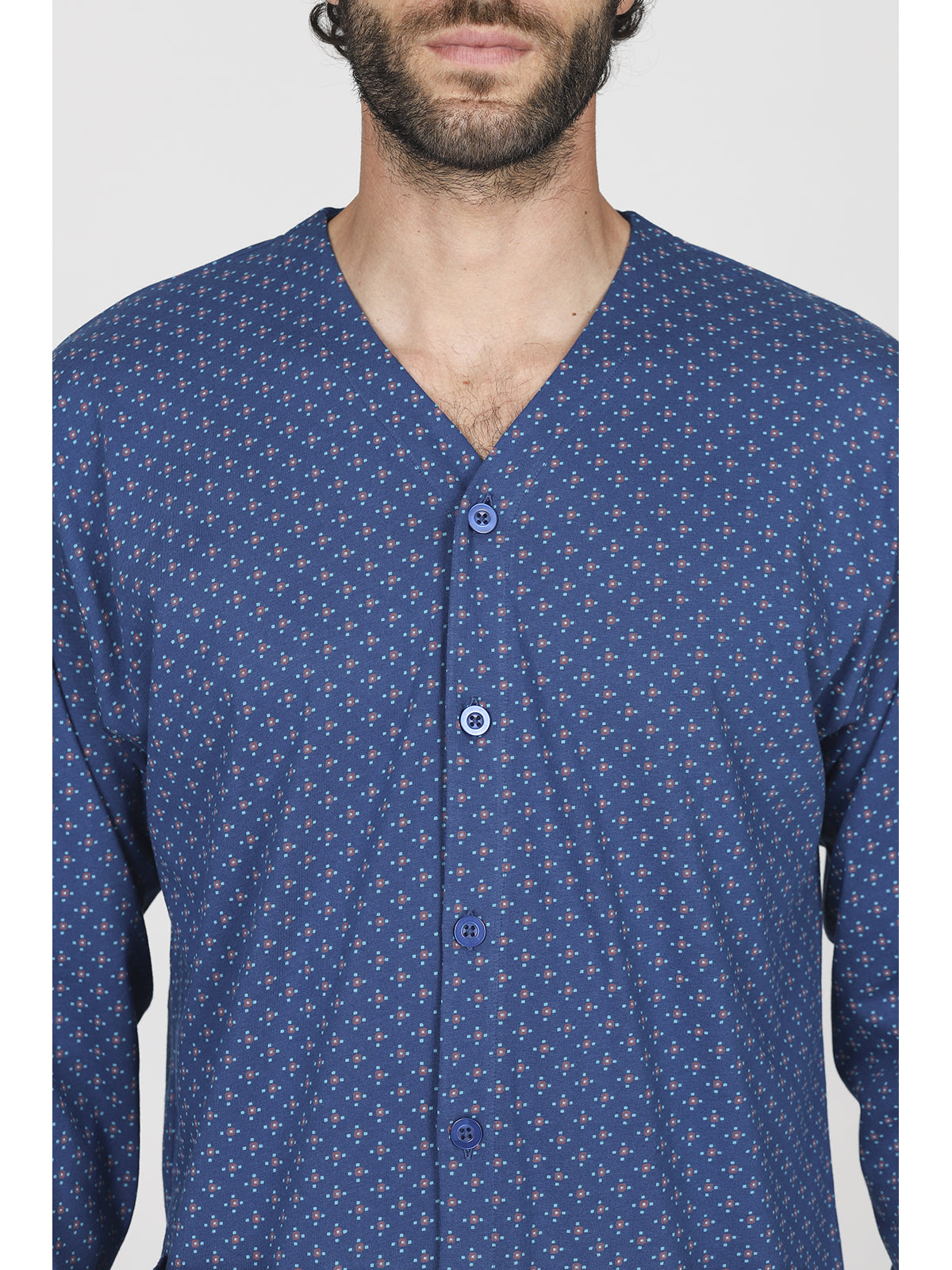 Pigiama lungo cardigan uomo in fresco jersey 30/1 di puro cotone. Elegante e raffinato capo notte, completo con giacca in classica fantasia cravatteria e pantaloni corti in tinta unita. Tradizione qualità a marchio Alpina.