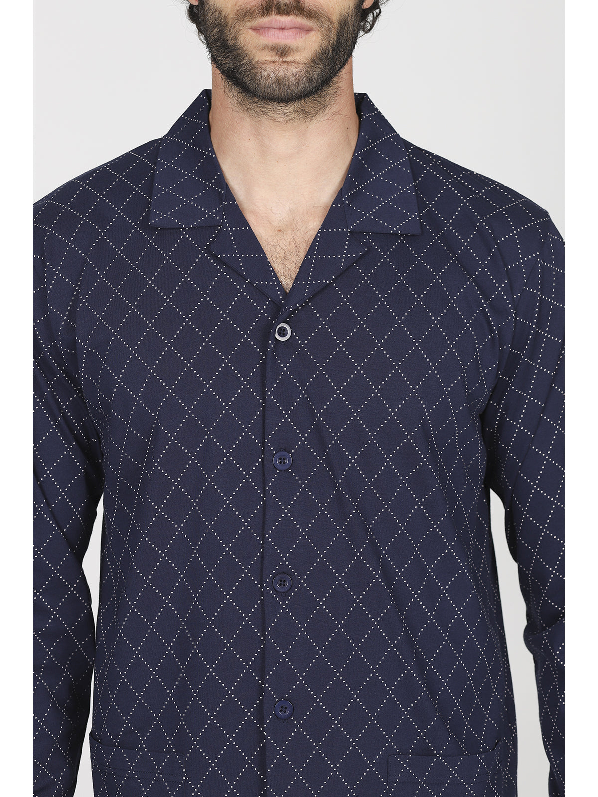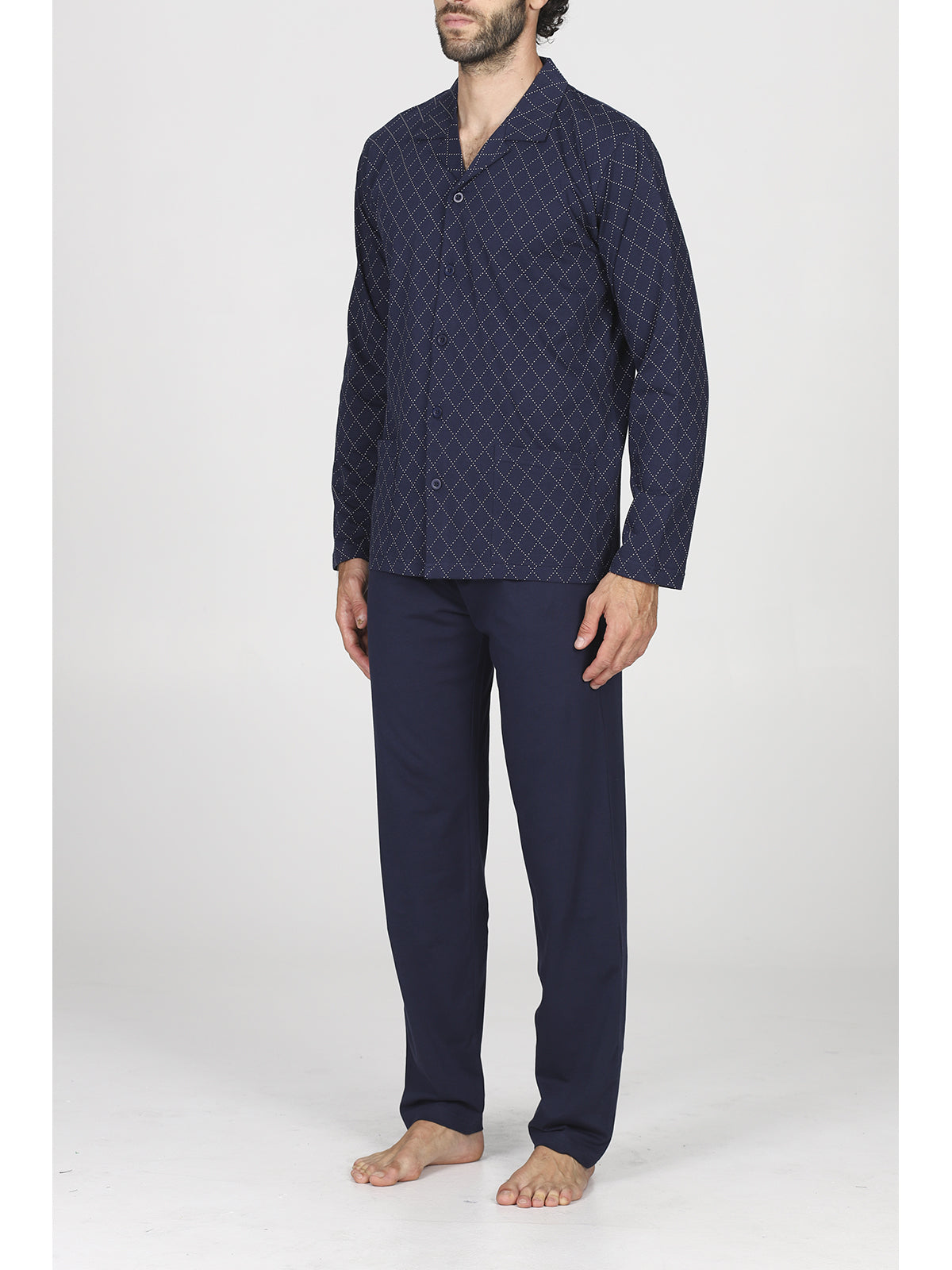 Pigiama lungo uomo in traspirante e fresco jersey 30/1 di puro cotone. Giacca in fantasia rombi modello cardigan, interamente apribile. Classico e raffinato capo notte, con pantalone in tinta unita.