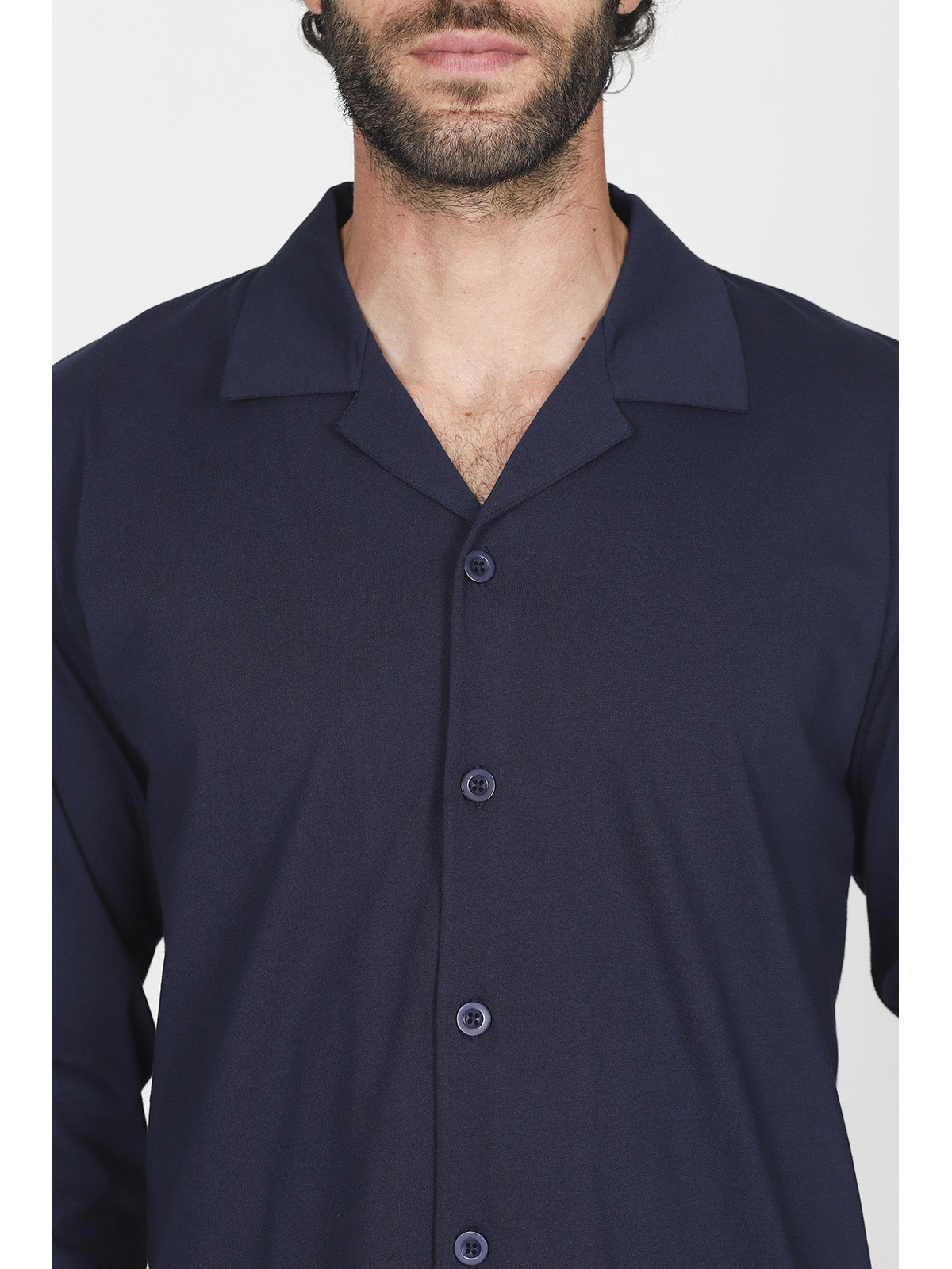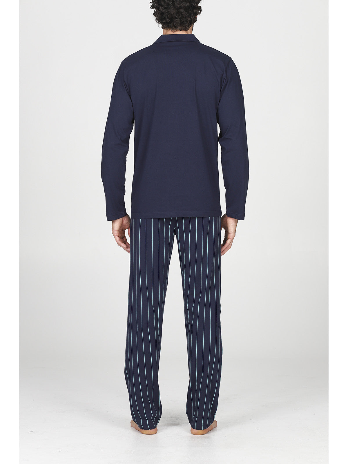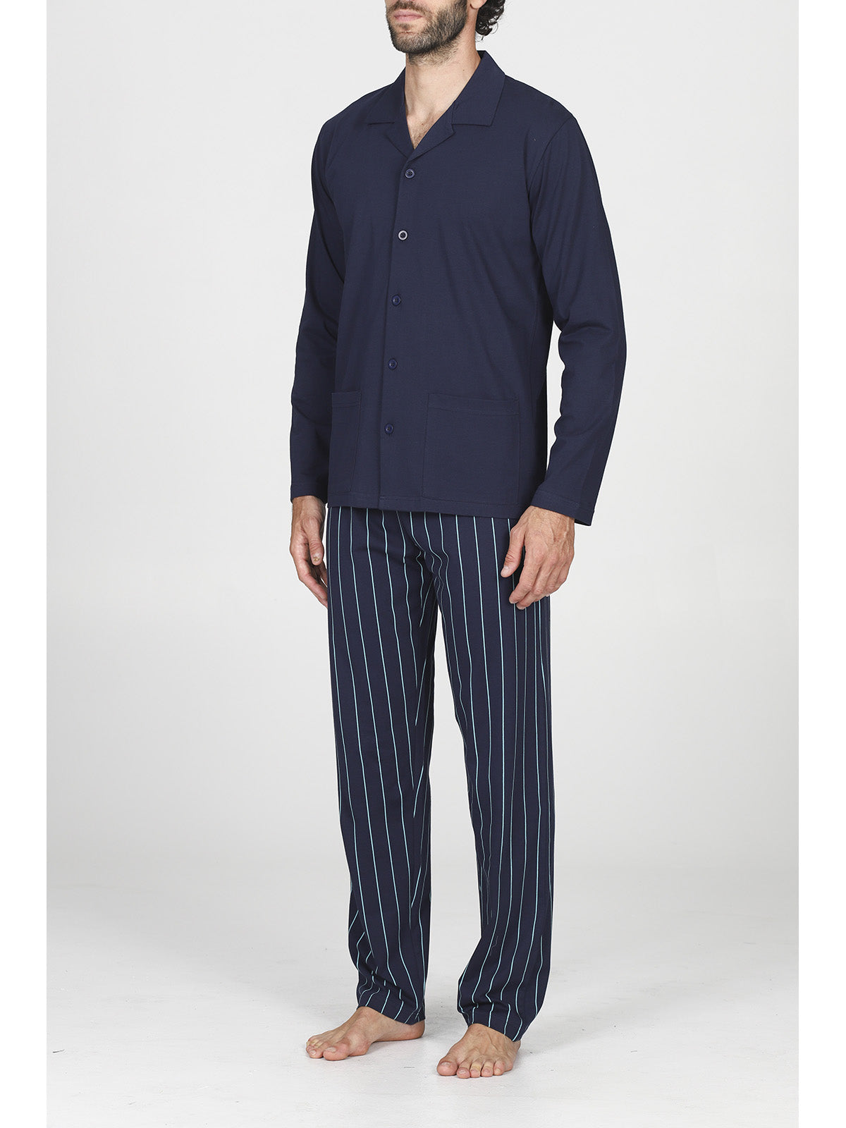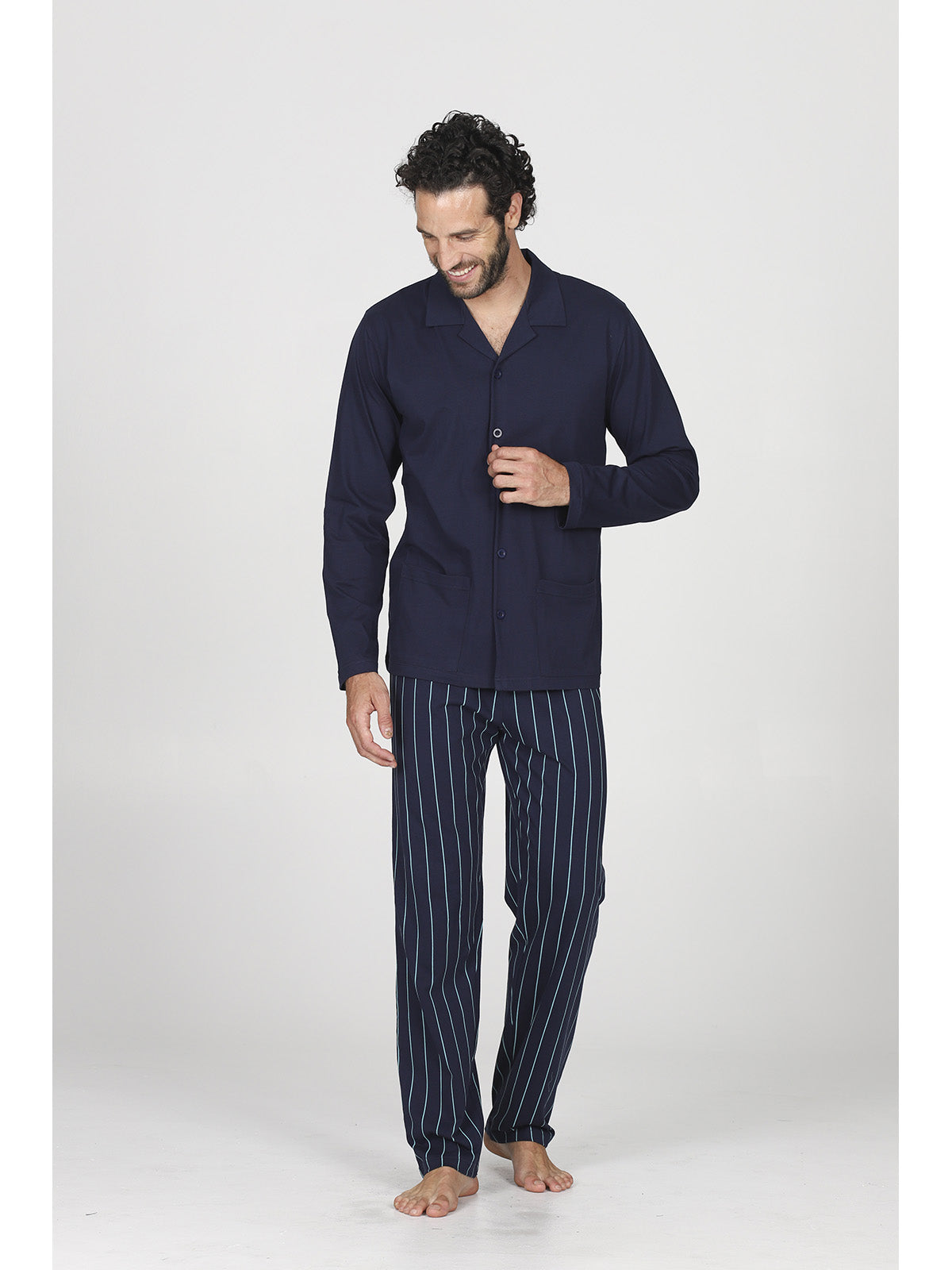 Pigiama lungo uomo in traspirante e fresco jersey 30/1 di puro cotone pettinato. Giacca modello cardigan a manica lunga con bottoni. Classico e raffinato capo notte, con giacca in tinta unita e pantalone in fantasia a righe.