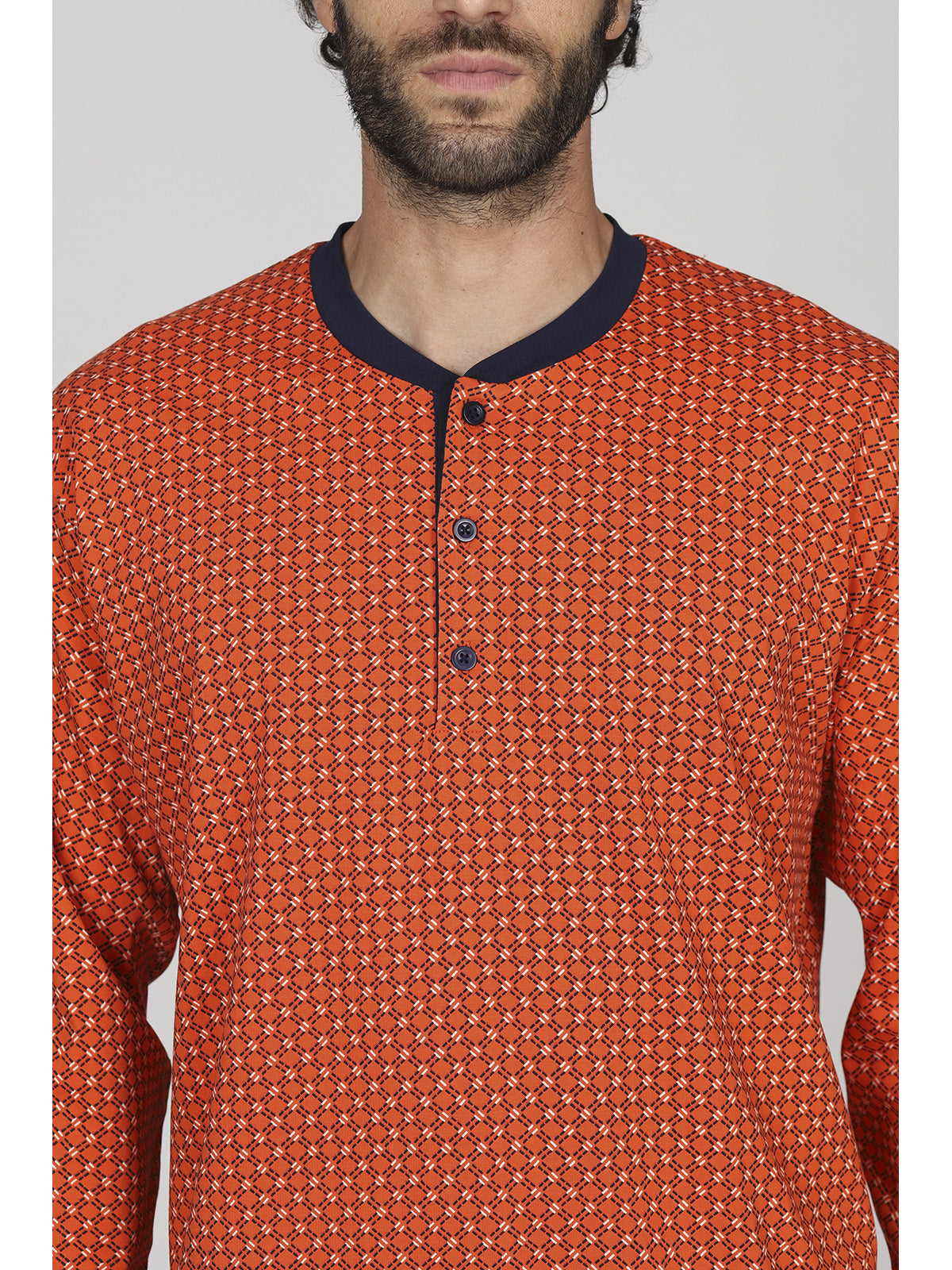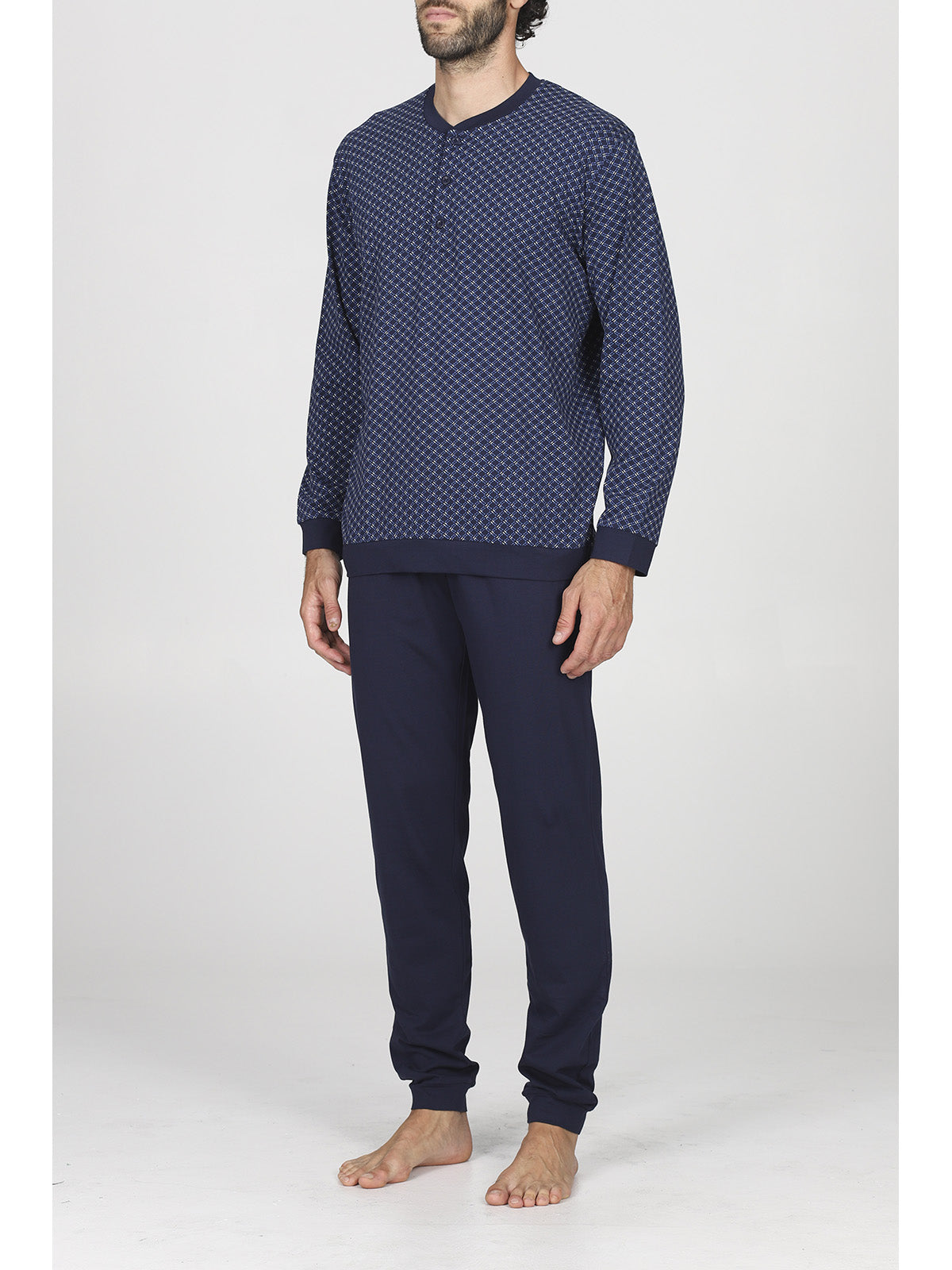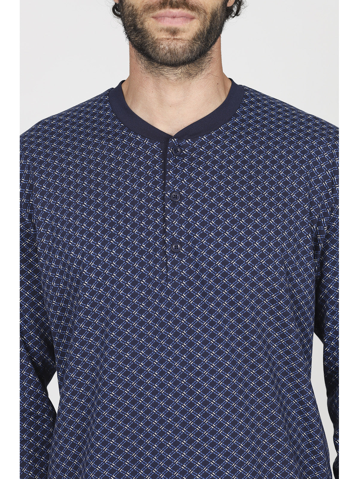 Pigiama lungo uomo in traspirante e pregiato jersey 30/1 di puro cotone. Giacca con sempre attuale stampa geometrica con scollo serafino, apertura 3 bottoni e pantalone in tinta unita. Classico e raffinato capo a marchio Alpina.