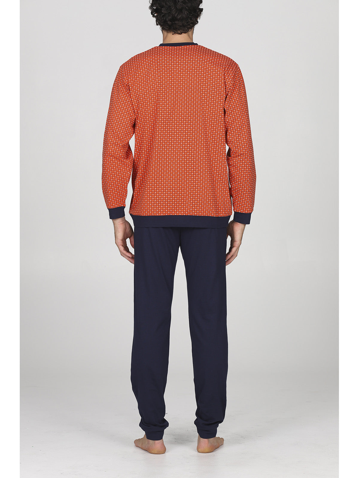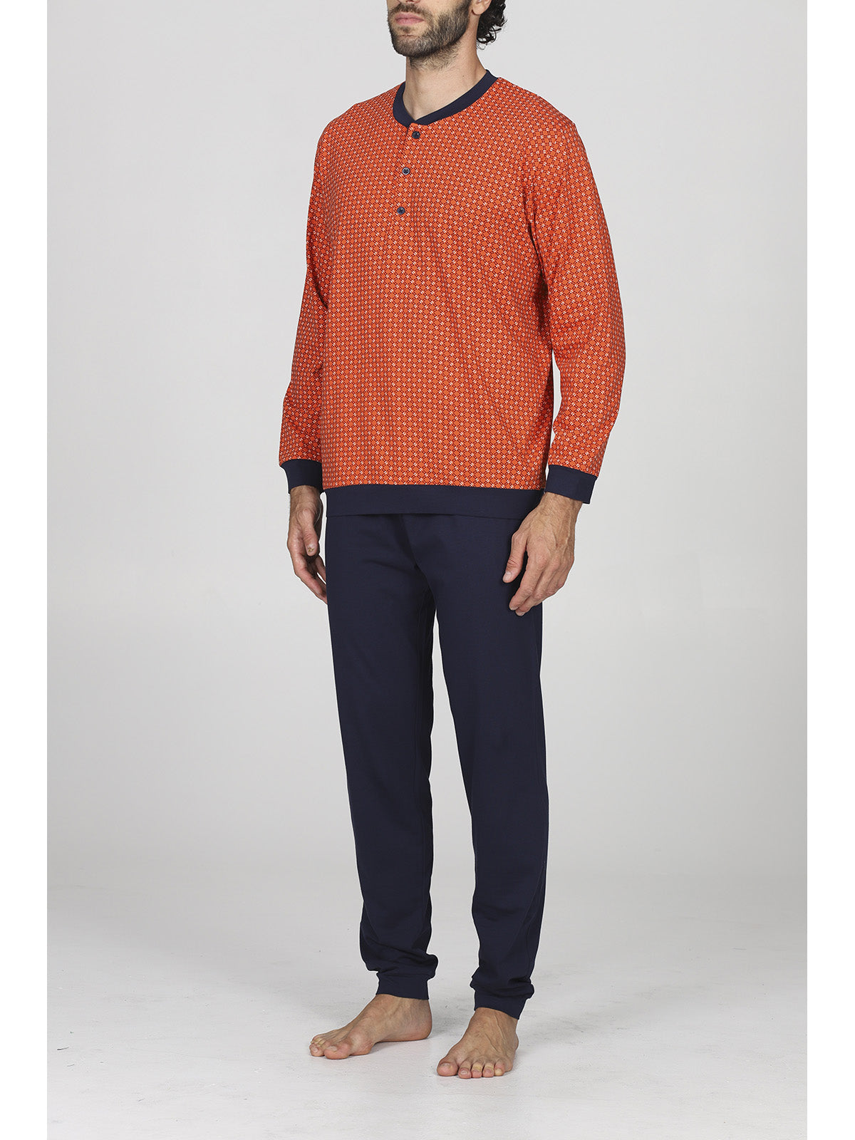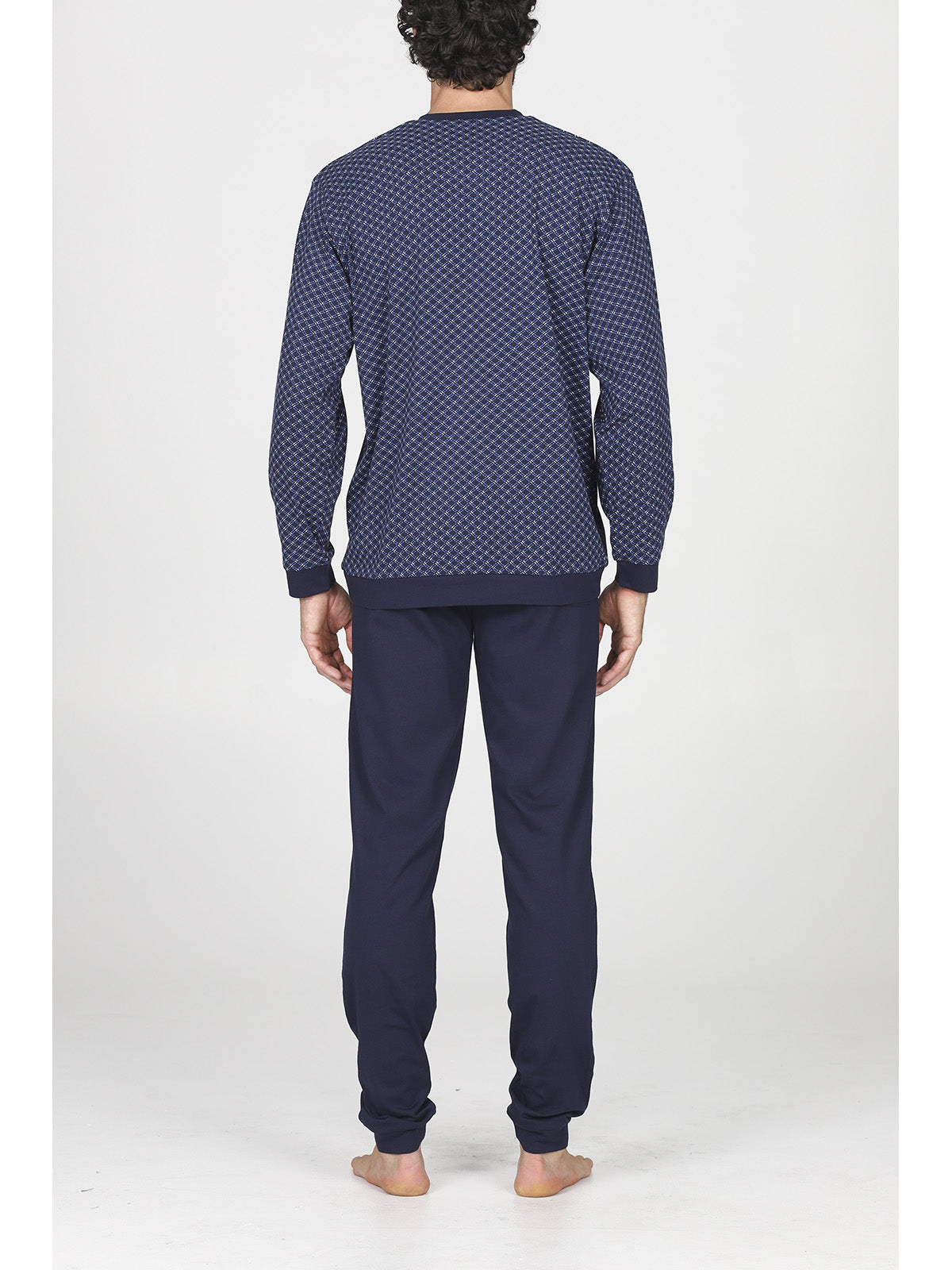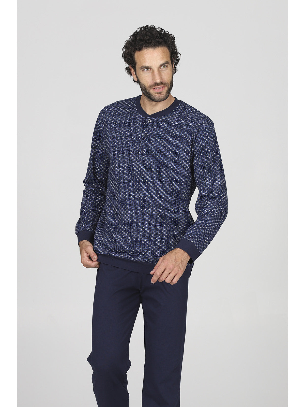 Pigiama lungo uomo in traspirante e pregiato jersey 30/1 di puro cotone. Giacca con sempre attuale stampa geometrica con scollo serafino, apertura 3 bottoni e pantalone in tinta unita. Classico e raffinato capo a marchio Alpina.