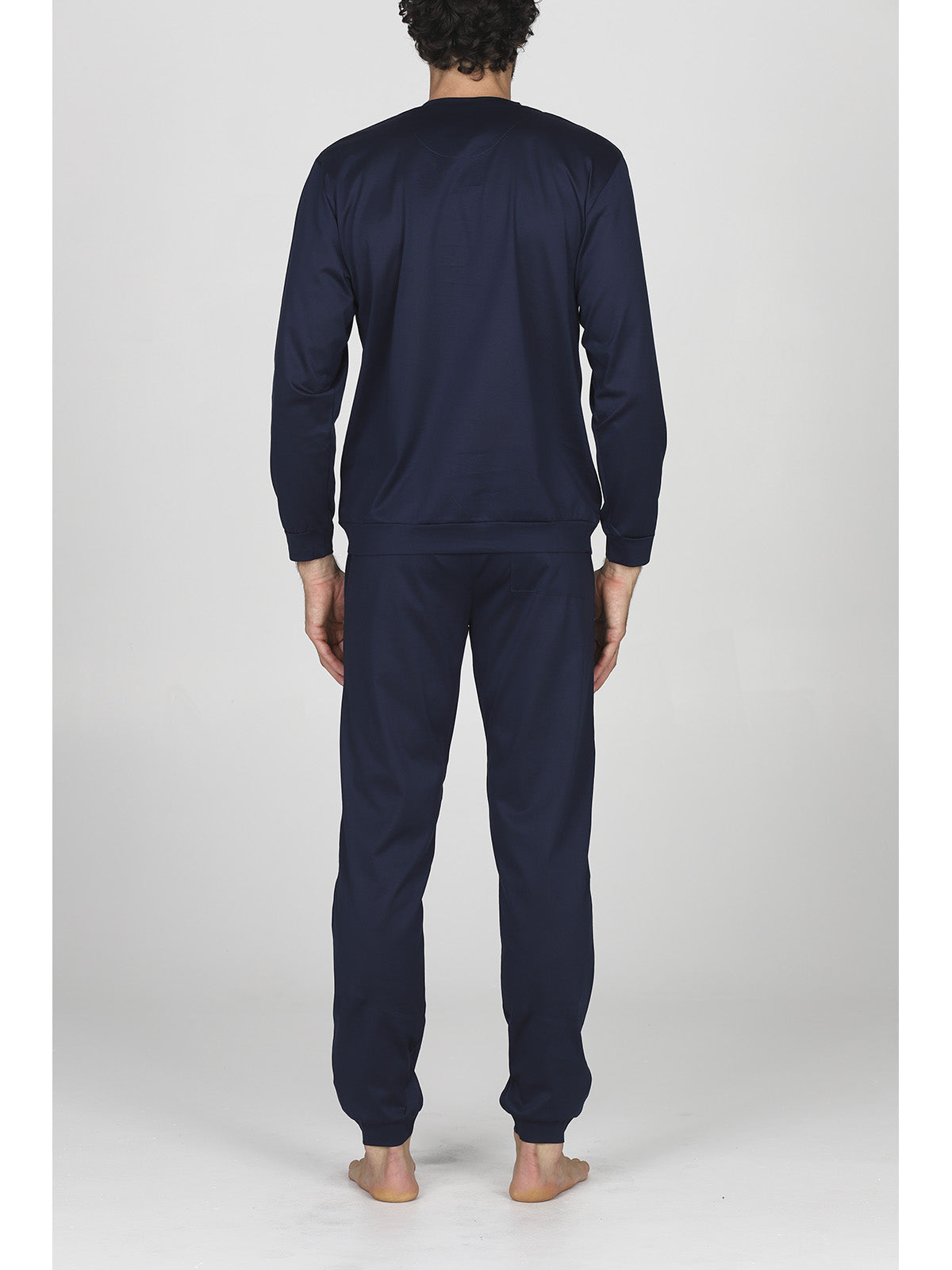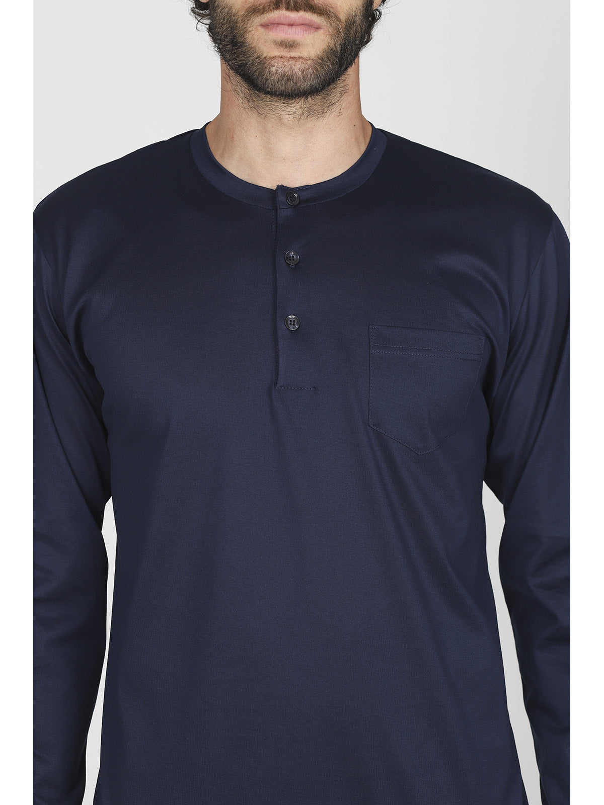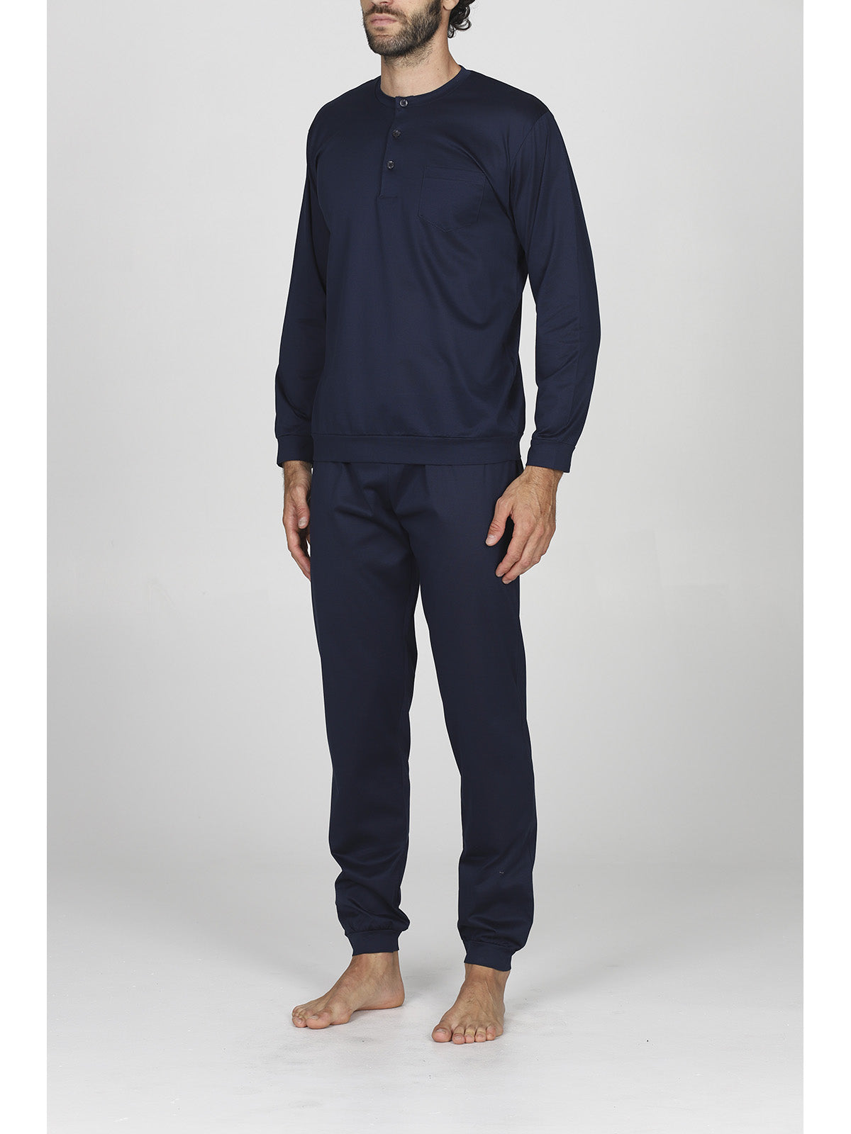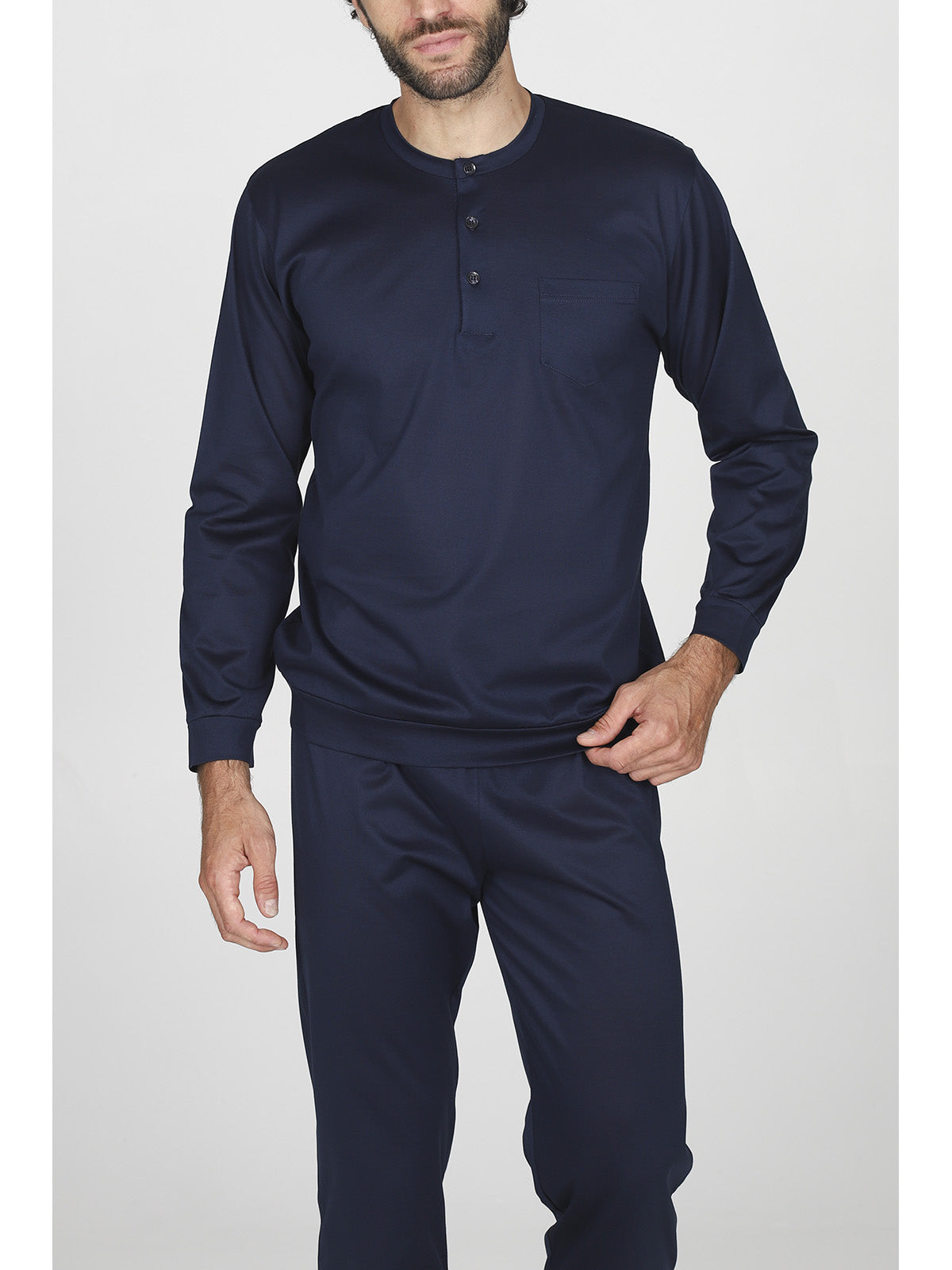 Pigiama lungo serafino uomo in brillante e setoso jersey 60/2 di puro cotone mercerizzato. Dettaglio taschino. Classico e raffinato capo notte, in tinta unita.