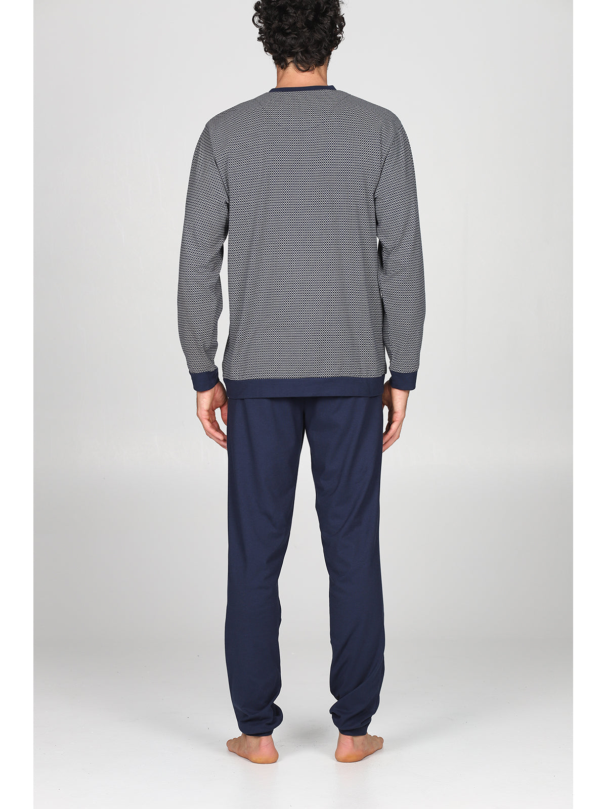 Pigiama lungo uomo in confortevole jersey 36/1 di puro cotone pettinato modello manica lunga con bordi. Maglia serafino in elegante fantasia e pantaloni in tinta unita con bordi al fondo. Taglio classico, dall'eleganza senza tempo, ideale per i tuoi momenti di relax.