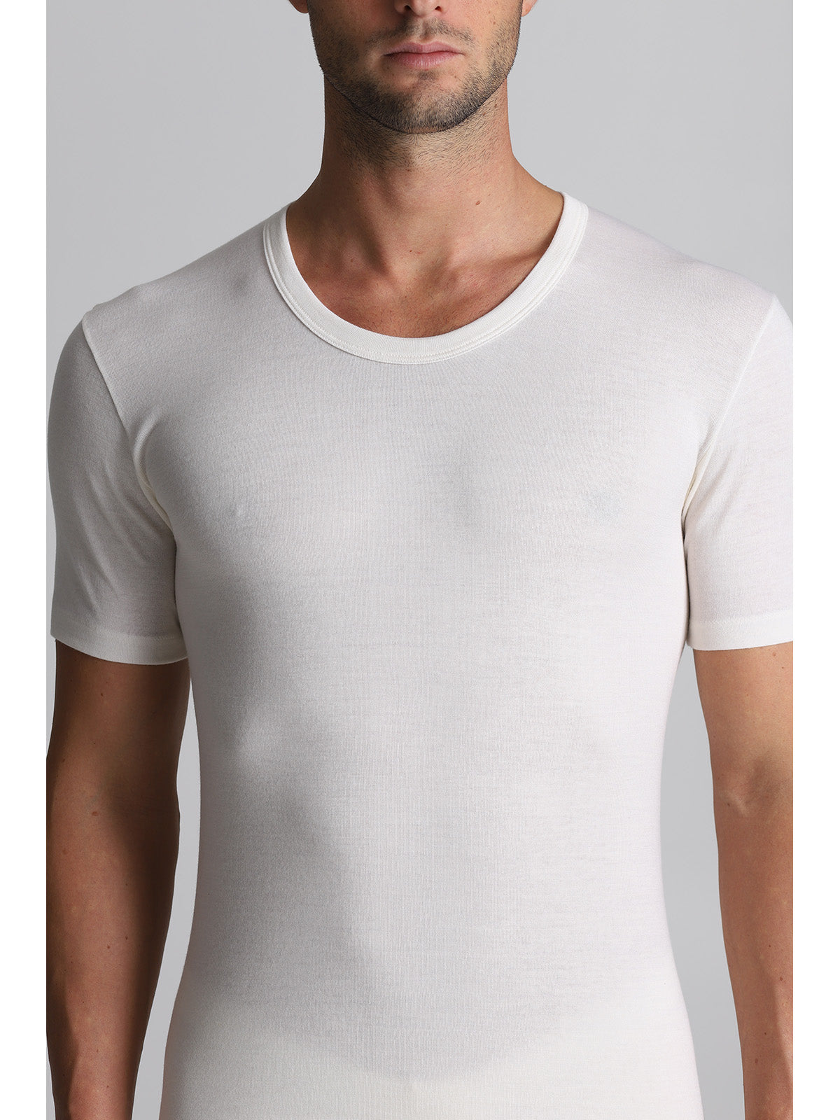Maglietta intima uomo modello mezza manica in costina Lana Seta e Cotone. Tutti i vantaggi di queste tre fibre naturali riunite in un unico prodotto per un comfort unico.