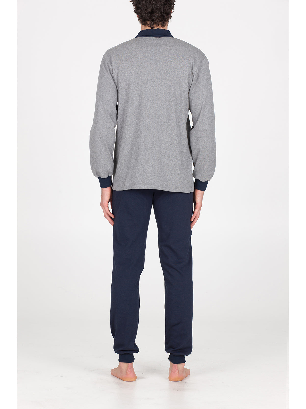 Pigiama uomo in interlock 36/1 di puro cotone: naturale, morbido, caldo e confortevole. Modello con maglia polo con polsini e colletto a contrasto ed elegante taschino. Pantaloni in tinta unita con bordi. Adatto alle stagioni più fredde: un must have per l'inverno.